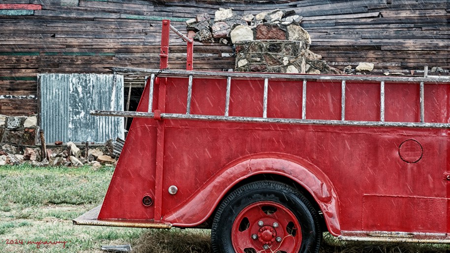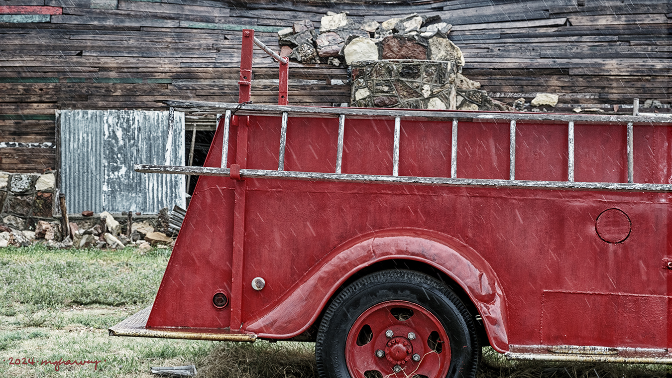 I mean, it’s a red fire truck (instead of a wheelbarrow) and there aren’t any white chickens.