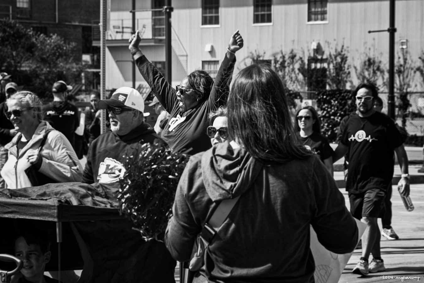 I am really enjoying my attempts at street photography so the discovery of the finish line was a good time to practice, and this exuberant woman made me very happy.