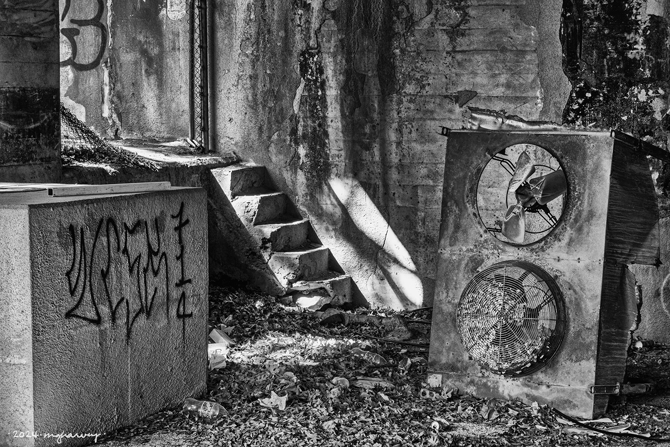 Instead of getting to see a nice train station interior, I looked at the graffiti-embellished and abandoned-looking space under the building. I was lucky enough to spot this extremely narrow stairway, nicely lit by the morning sun.