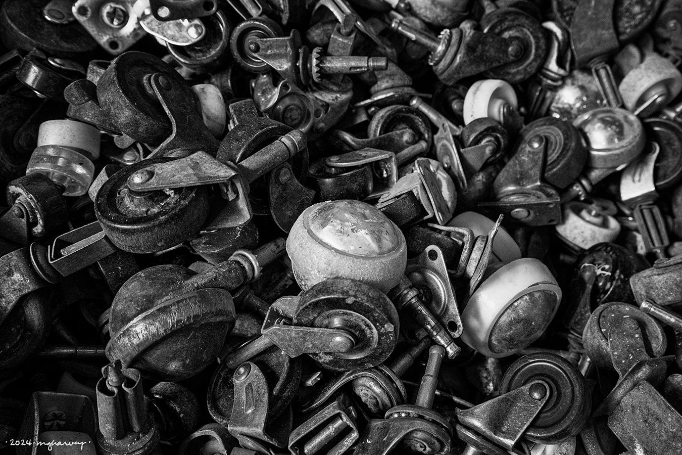 This is that cemetery. I made it all the day to the far side (which wasn’t that far – it was a very small place) by walking on the concrete curbs around the graves. It was barely worth the trip because I couldn’t get good angles on the place without getting closer than I wanted to be to all the stickers. The consolation prize is this: a dead flower head and a couple of markers and some bokeh.