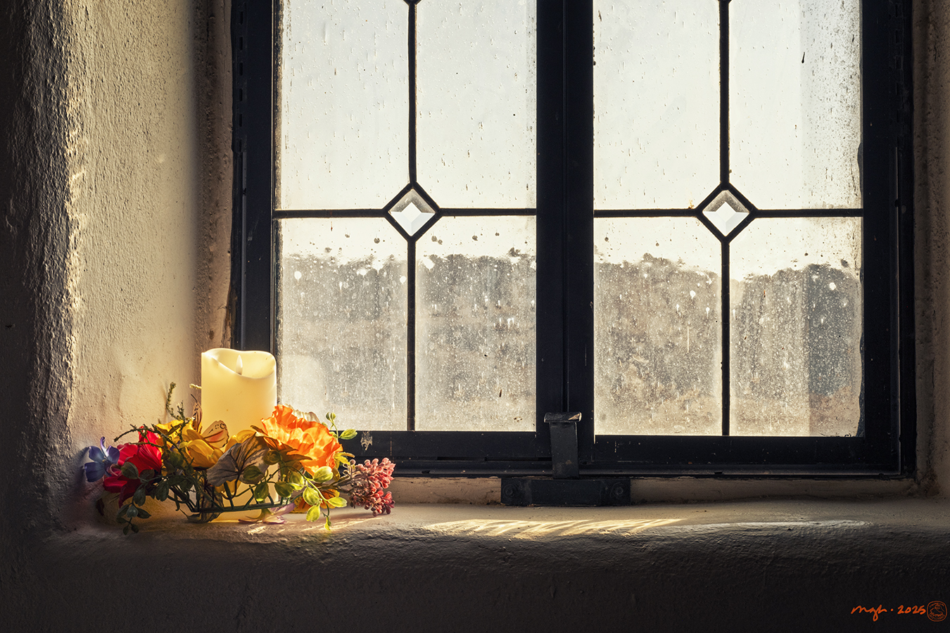 This had the chance to be poignant scene – flowers and a candle next to wavy glass in a ghost-town church.