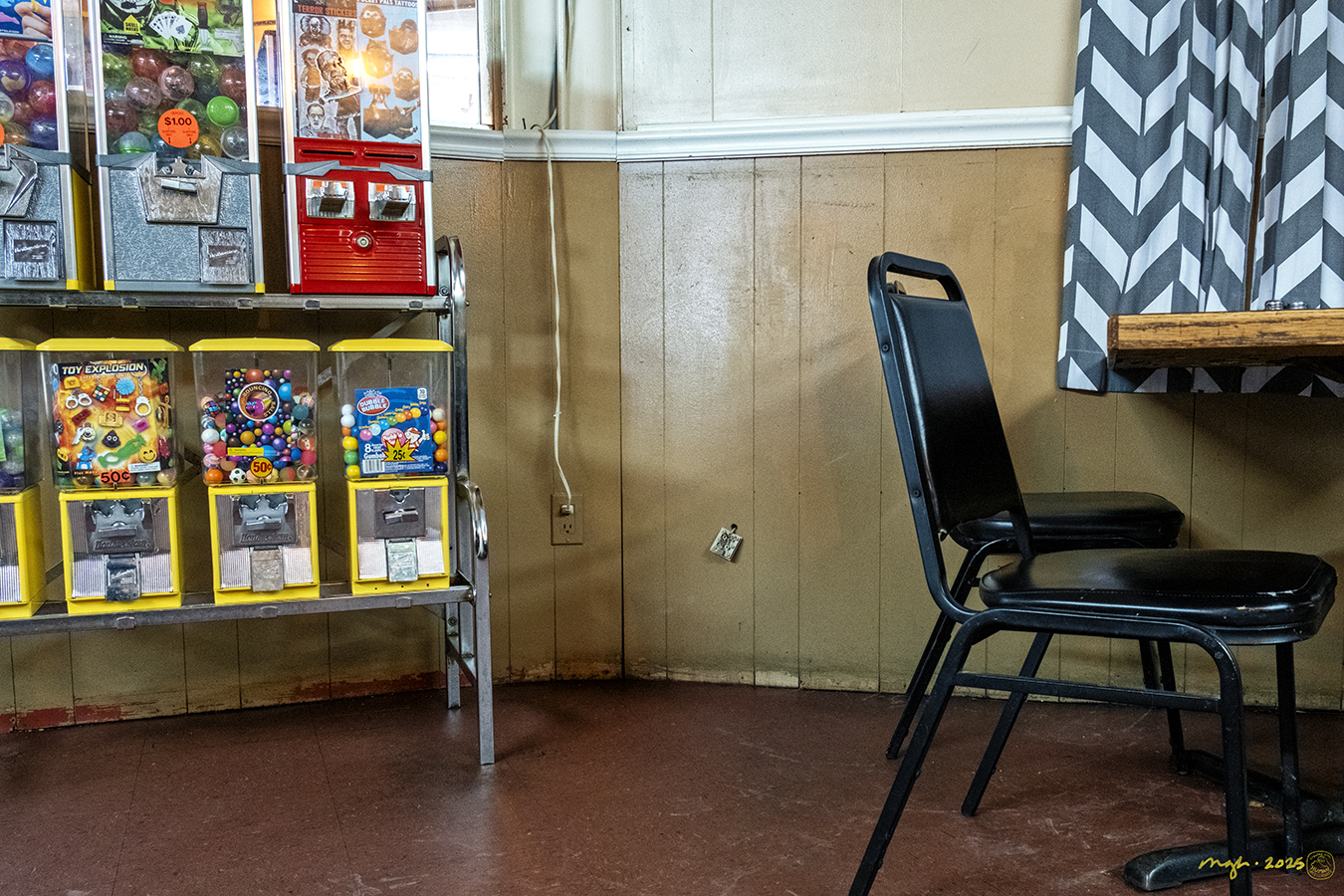 This is why I’d rather have a road-trip lunch at a hometown place instead of a chain restaurant out on the Interstate. I love the randomness of it all – the lack of a baseboard, the way the wainscoting doesn’t quite match, the cord and outlet, the weird silver thing hanging off the wall, and (the best part) those vending machines.