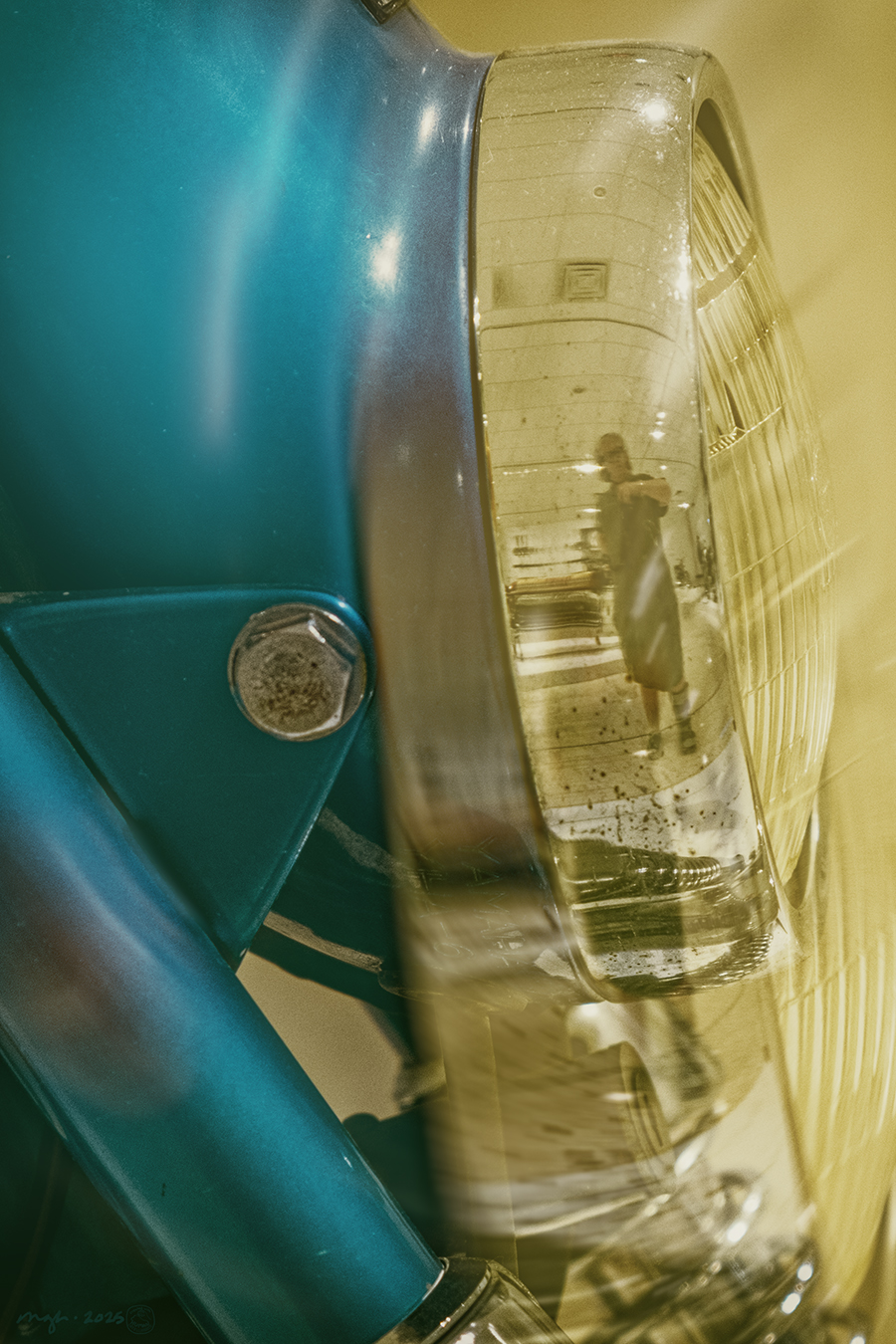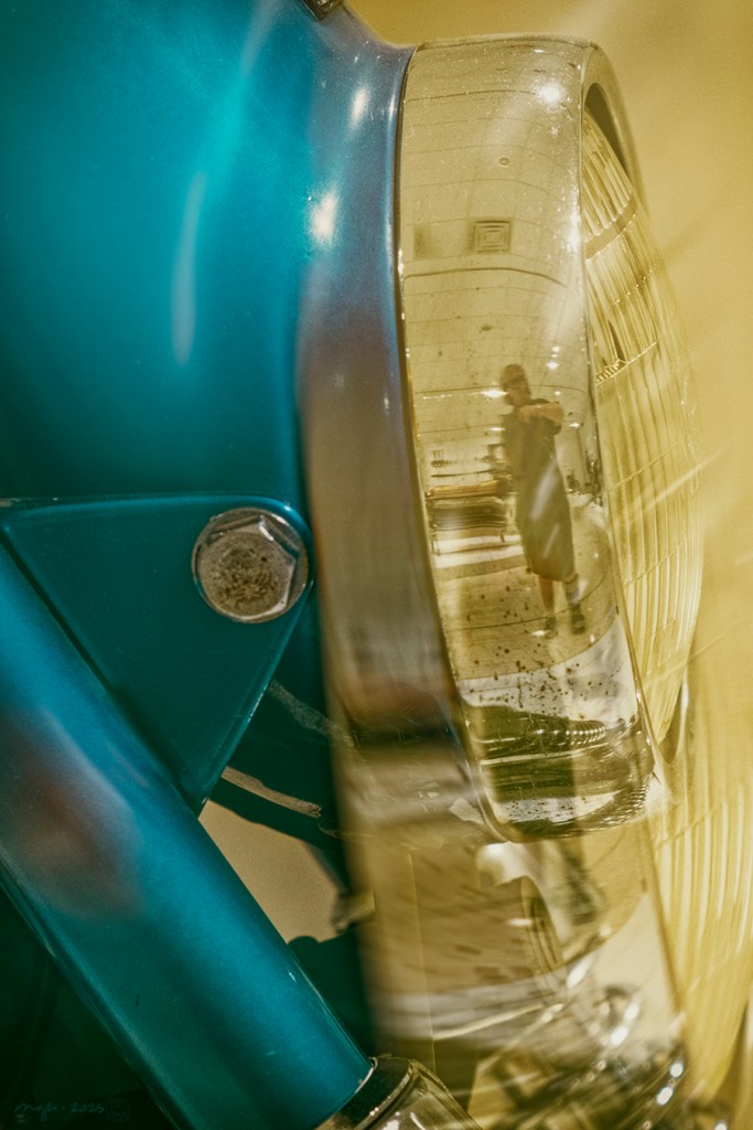 Well, look at that! There I am, reflected in the headlight rim of an old motorcycle! (In real life, I am taller.)