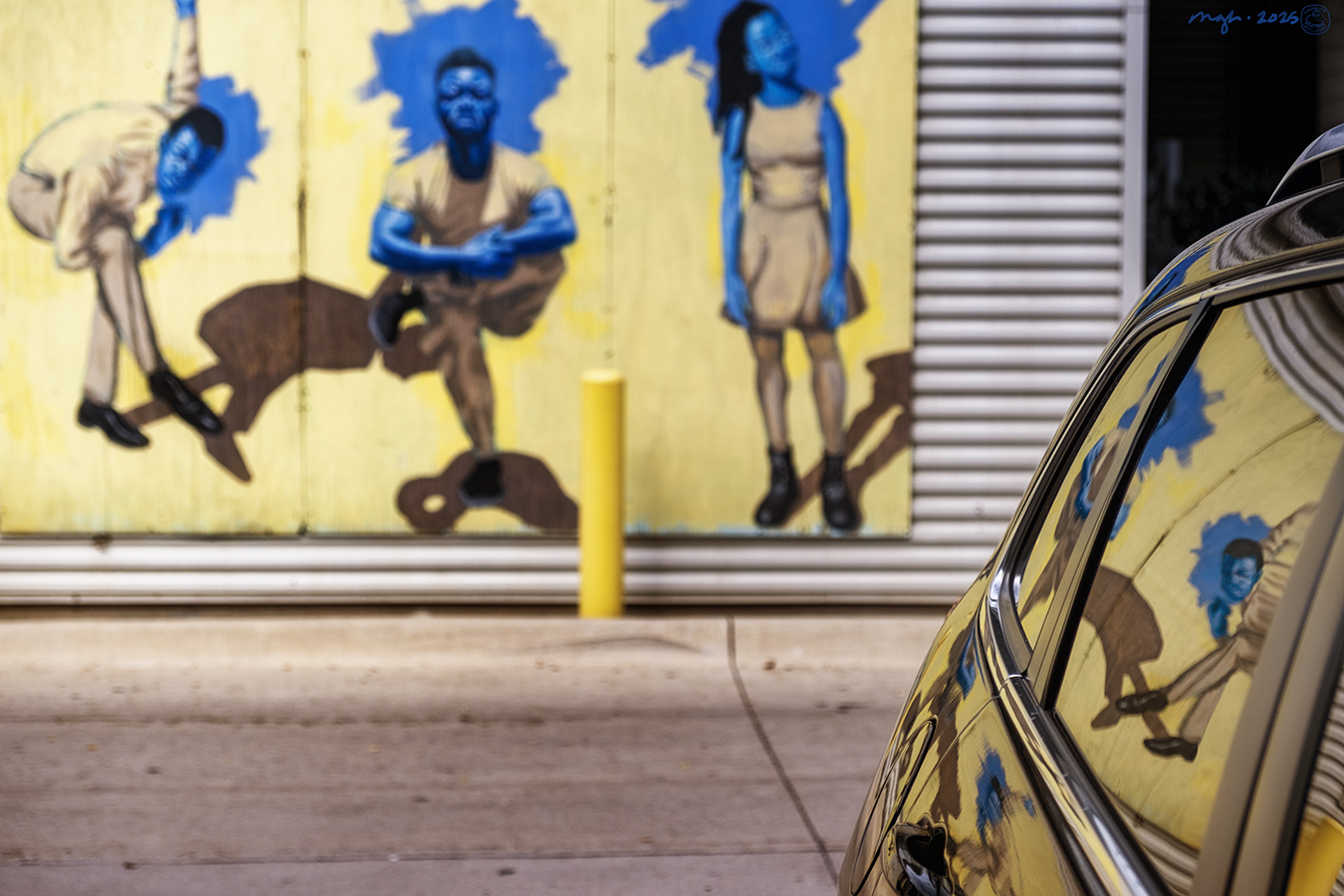 I was walking toward the mural to get a photo and noticed the reflection in the car window; my trip was halted right then.