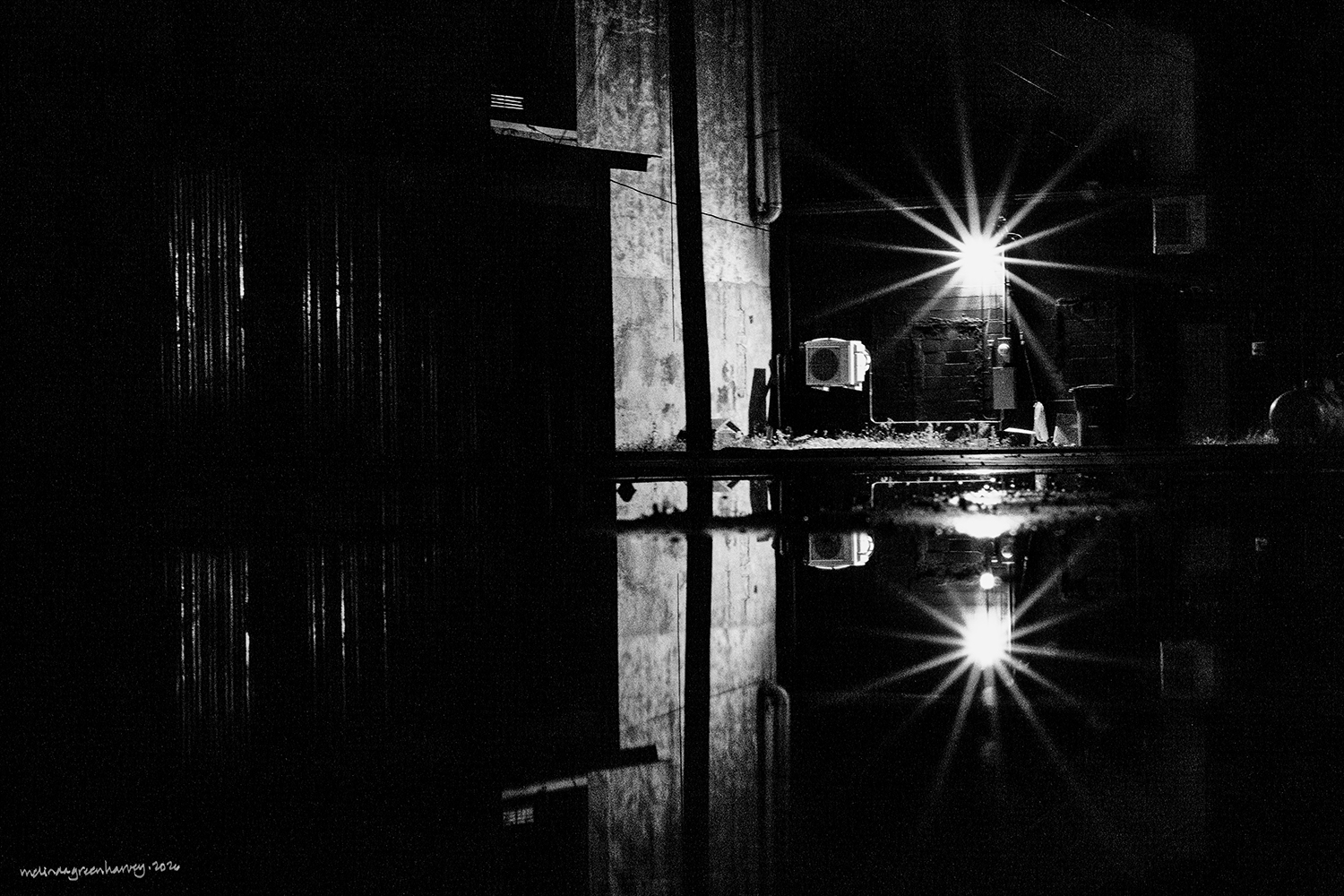 It was very dark in the puddly vacant lot and I wasn’t even real sure what I was going to end up with. What I like is that the night, the reflections, and the puddles worked together to turn an extremely ordinary setting into something that’s unexpected.