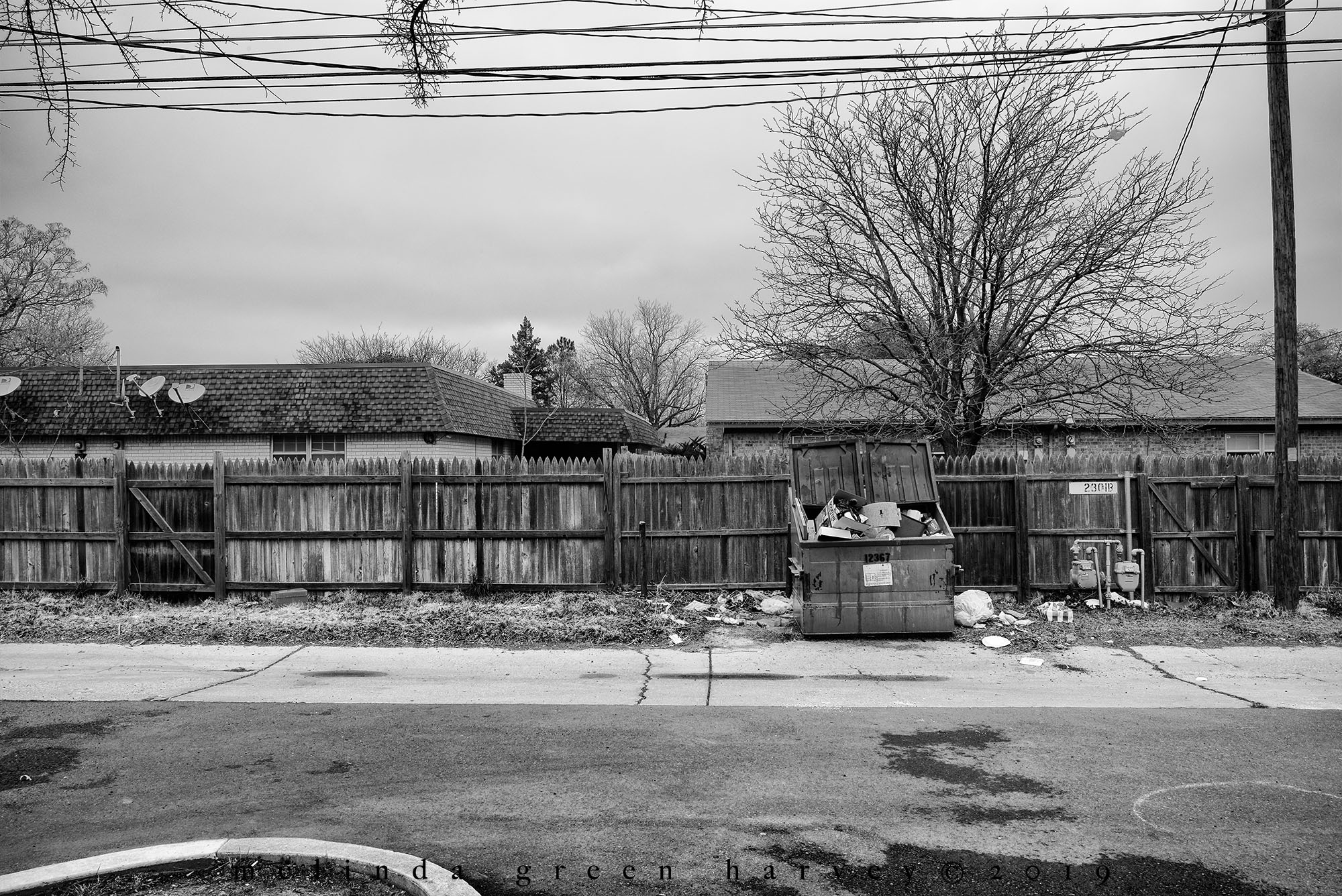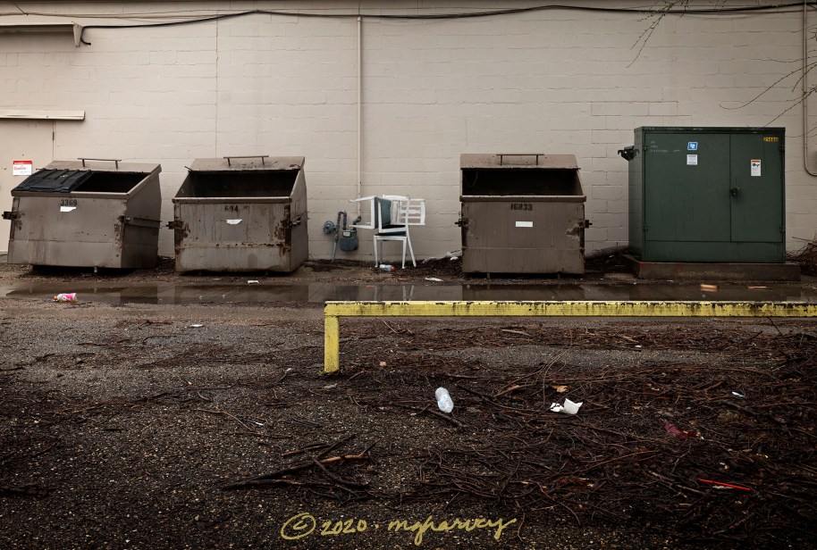One of the oldest pink cards has the phrase “bearing this beauty” written on it. (Also: I always write with a Sharpie. More process). That’s a phrase I heard somewhere and decided was a good descriptor for a project photographing (reading from the green cards) dumpsters, car washes, laundromats, and parking garages – things that are generally not associated with beauty. I’ve already photographed a lot of these things, and somehow the time seemed right to unveil the title. Of course, these dumpsters are joined by an electrical box, a pile of chairs, and that yellow thing. More beauty, if you want to think of it that way.