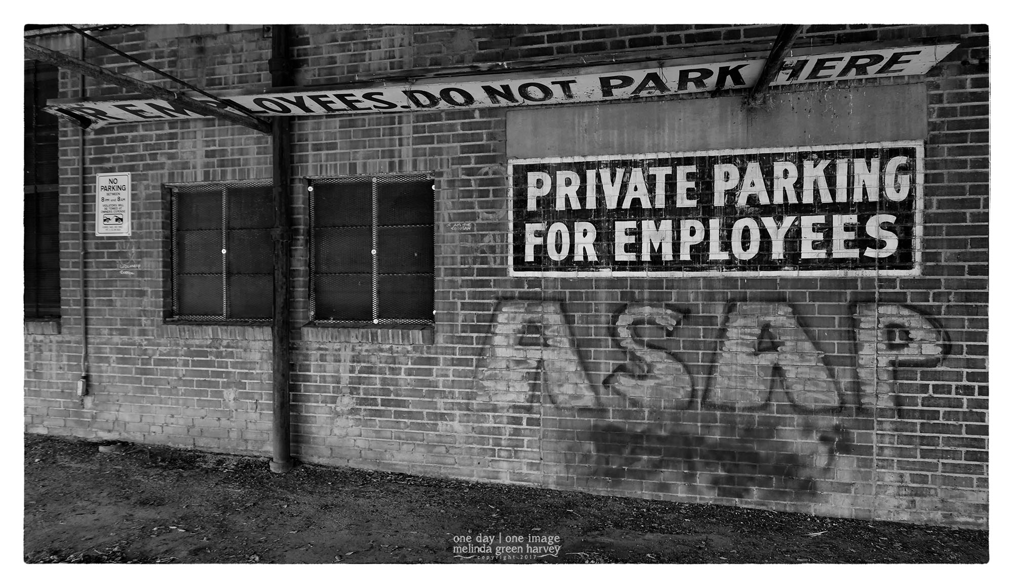 I like the little window air conditioner. And I like the scraggly tree, trying to make a go of it, even though it’s not likely anyone tends to it. I like the metal door. I like the texture of the wood at the top of the building and how it contrasts with the brick.