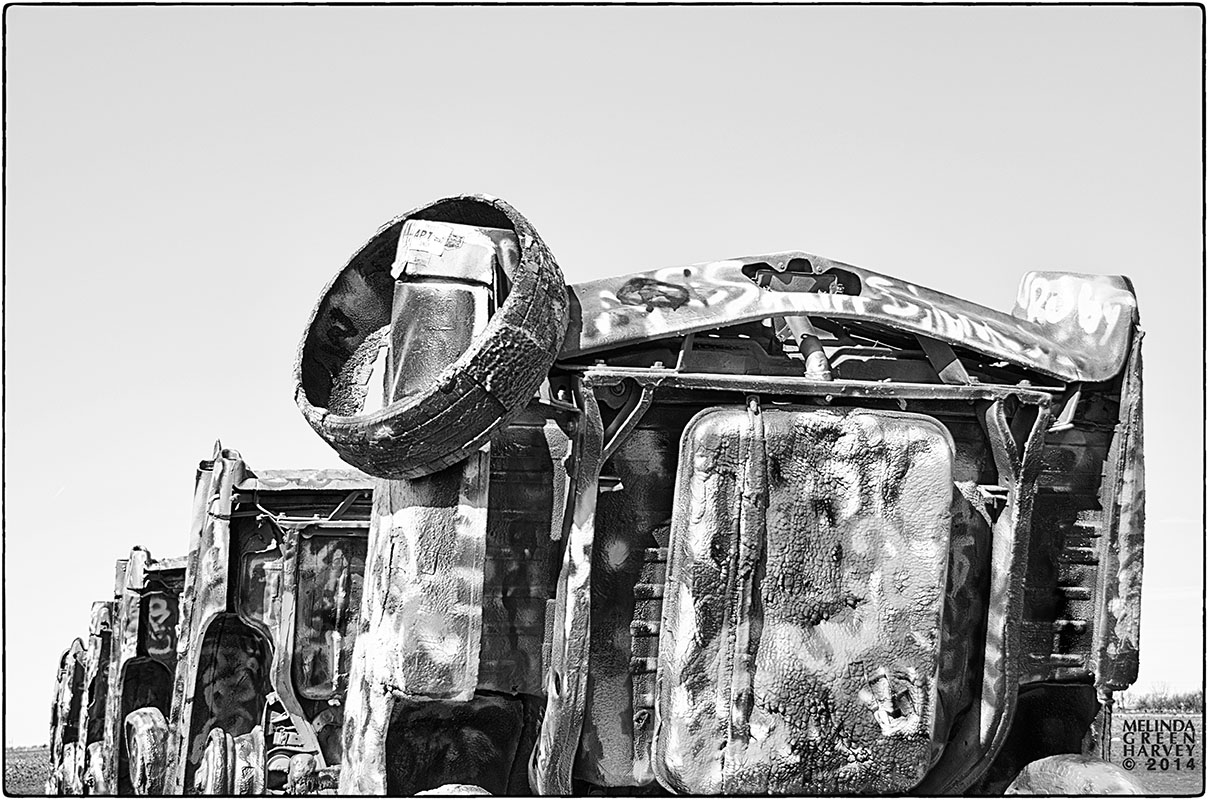 A continuation of yesterday’s post about the Cadillac Ranch, this shot features the tail fin of one of the cars. On parts of the cars that are easy for spray-painters to reach, the layers of paint is several inches thick. And almost everywhere the paint has dripped and bubbled, something which would have never occurred on these cars when they were new.