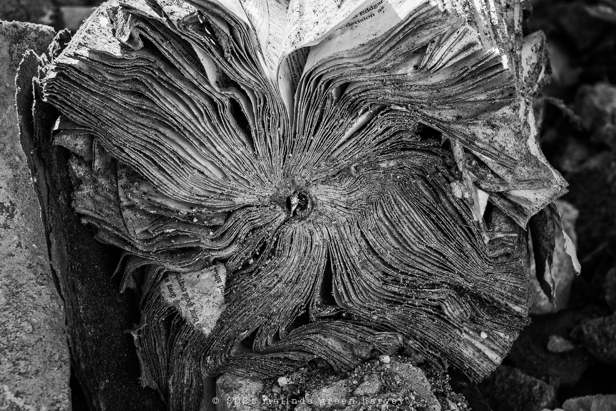 Here’s one more burnt book. I love that the word “derision” is almost the only legible word. I love the texture that the wet book took on as it dried. But mostly, I love that it reminds me of a chrysanthemum in full bloom. If, you know, chrysanthemums were made of paper and were charred and wet from a fire and were in black and white.