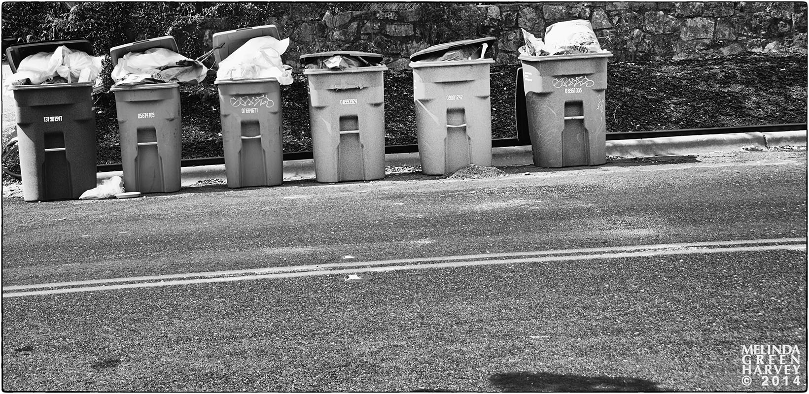 These trash bins met that standard. I liked how they were almost perfectly spaced and I liked how they tilted down the street to the little bridge over East Bouldin Creek.