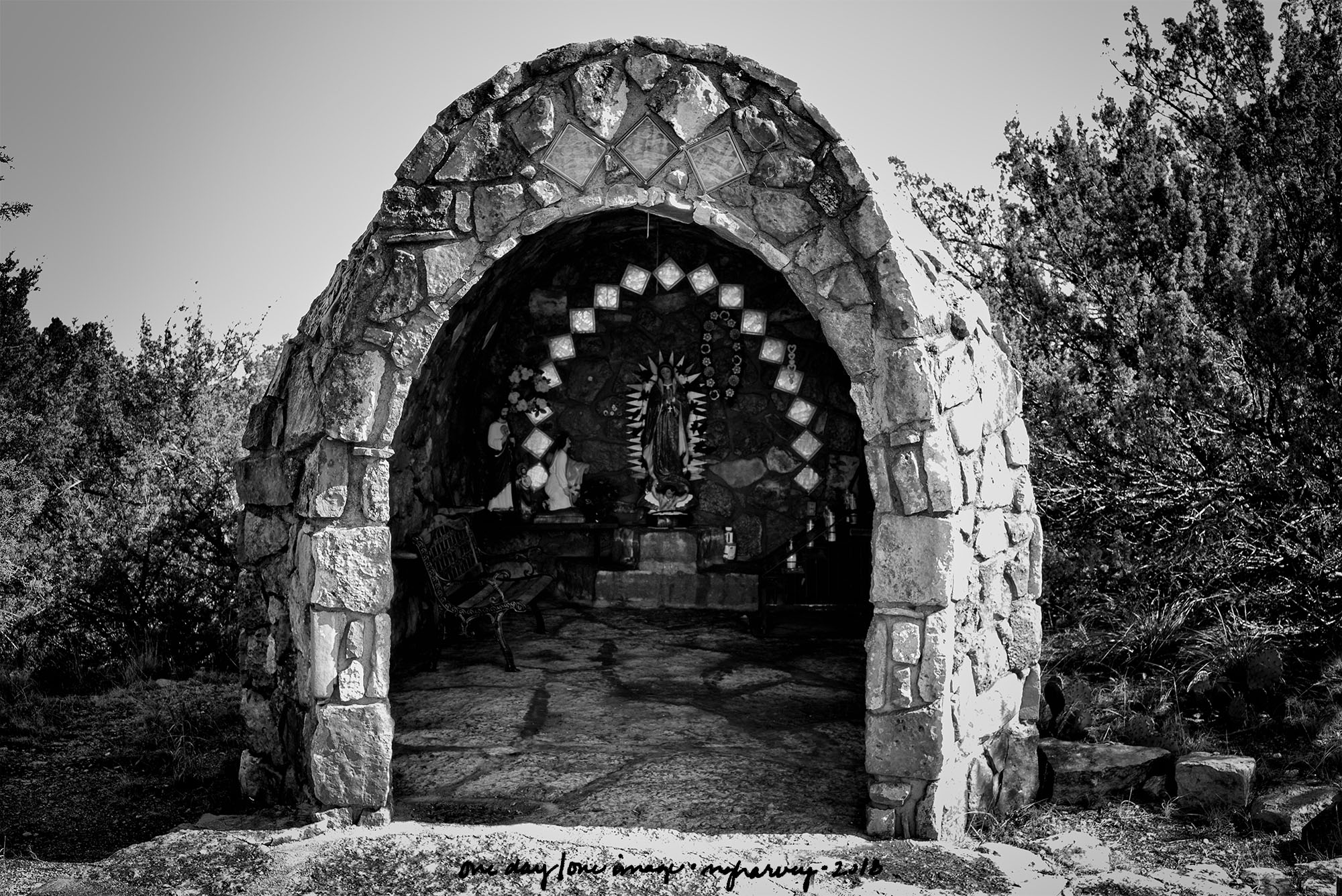 Down the hill a short way from this giant cross, there are a couple of grottoes, shrines to Our Lady of Guadalupe. This one had a small rack of devotional candles (some of them lit), a bench, and a broom.