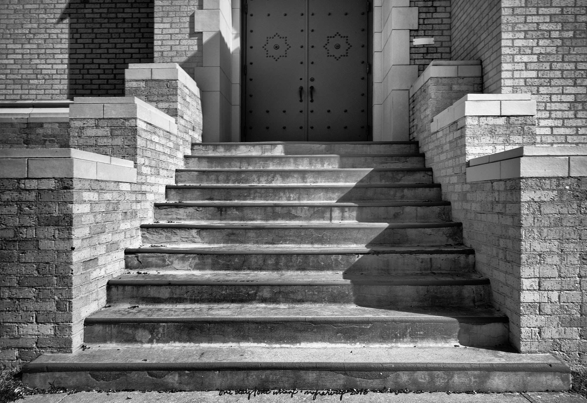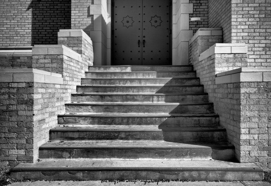 While I am drawn to things that are falling apart or are otherwise not symmetrical, sometimes a formal arrangement does catch my attention. That’s what happened here, with the steps and the brick and the pattern on the doors and the shadows, all lining themselves up perfectly.