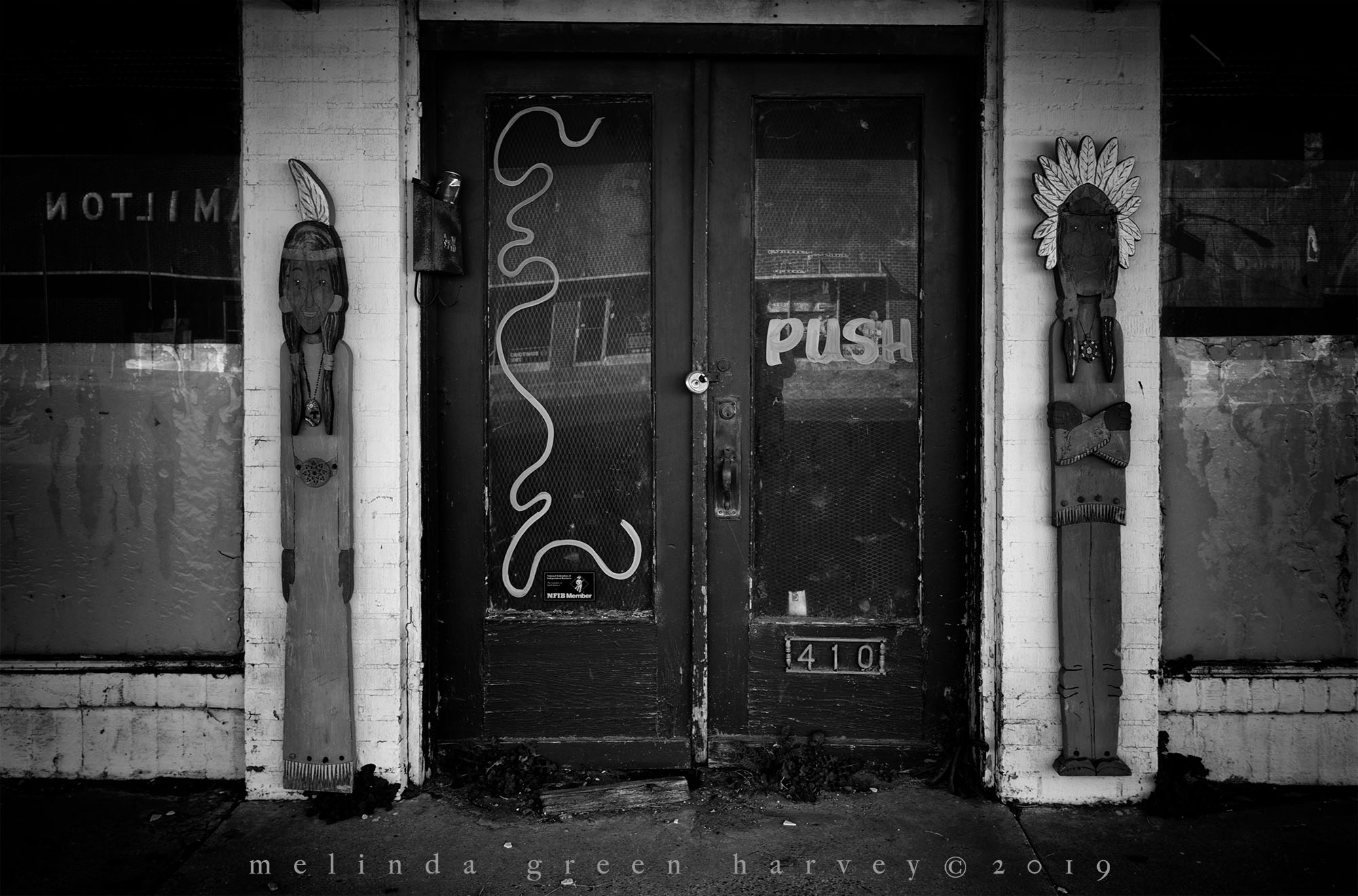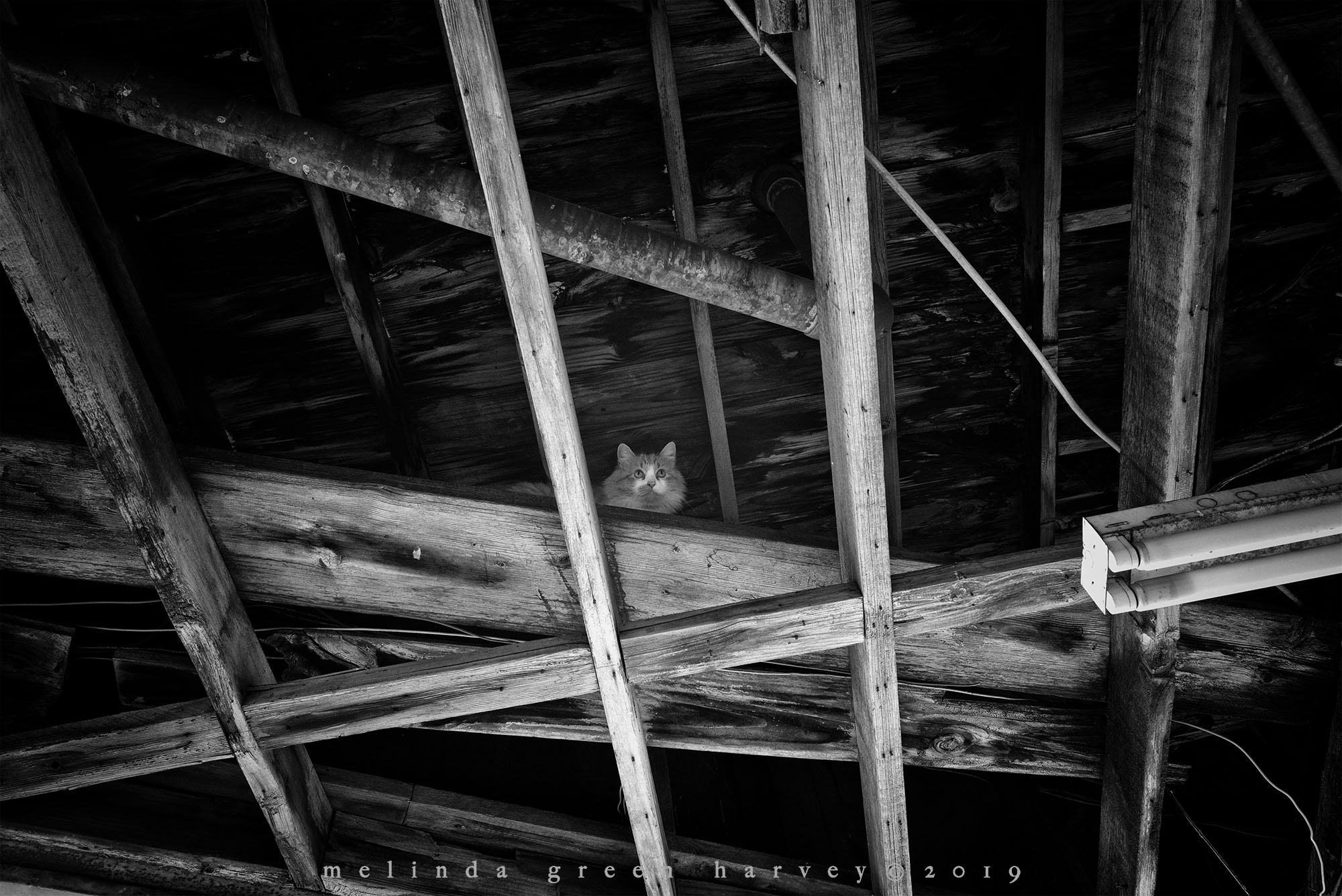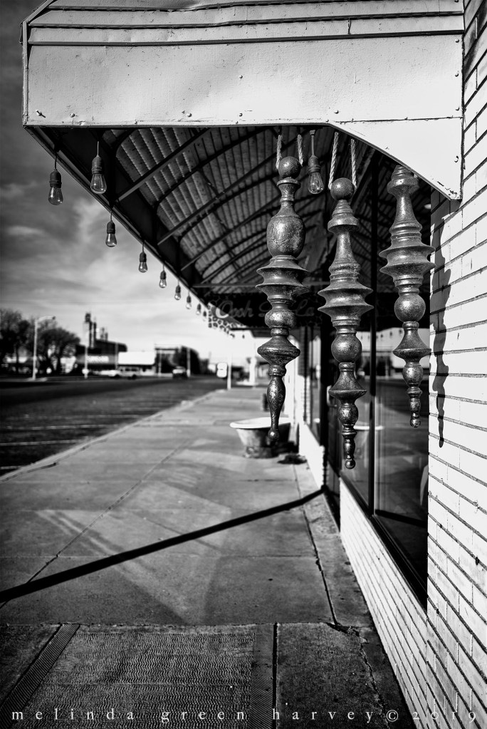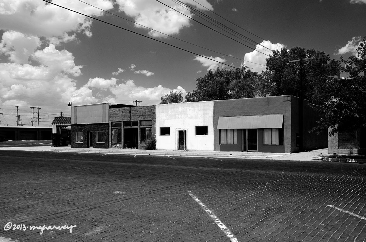 I was in Brownfield, Texas, on a Sunday morning, doing my thing – checking out stuff downtown. I found the vacant movie theater, and shot a photo through a broken window to get the interior. Then I turned around, and let my gaze track across the marquee that jutted over the sidewalk. Two-thirds of the way across it, I saw this cat, just chilling in the joists. I was a lot less chill when I spotted her, but after I got over the initial surprise, I laughed. Then I made a photo.