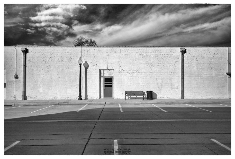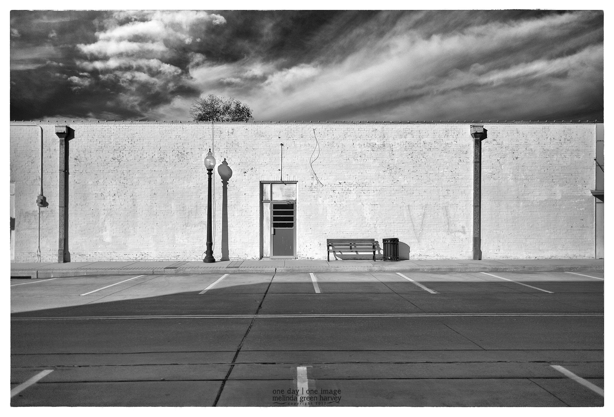 A side street in downtown Bryan seems plain, but if you look at it long enough the subtle complexities start to show up. Like the rhythm of the parking-space lines. The pair of downspouts bracketing the door. The paired up bench and trash can. The street light’s shadow. A bit of graffiti. A wavy bit of wire hanging from the wall. The line that crosses the street and heads straight to the door.