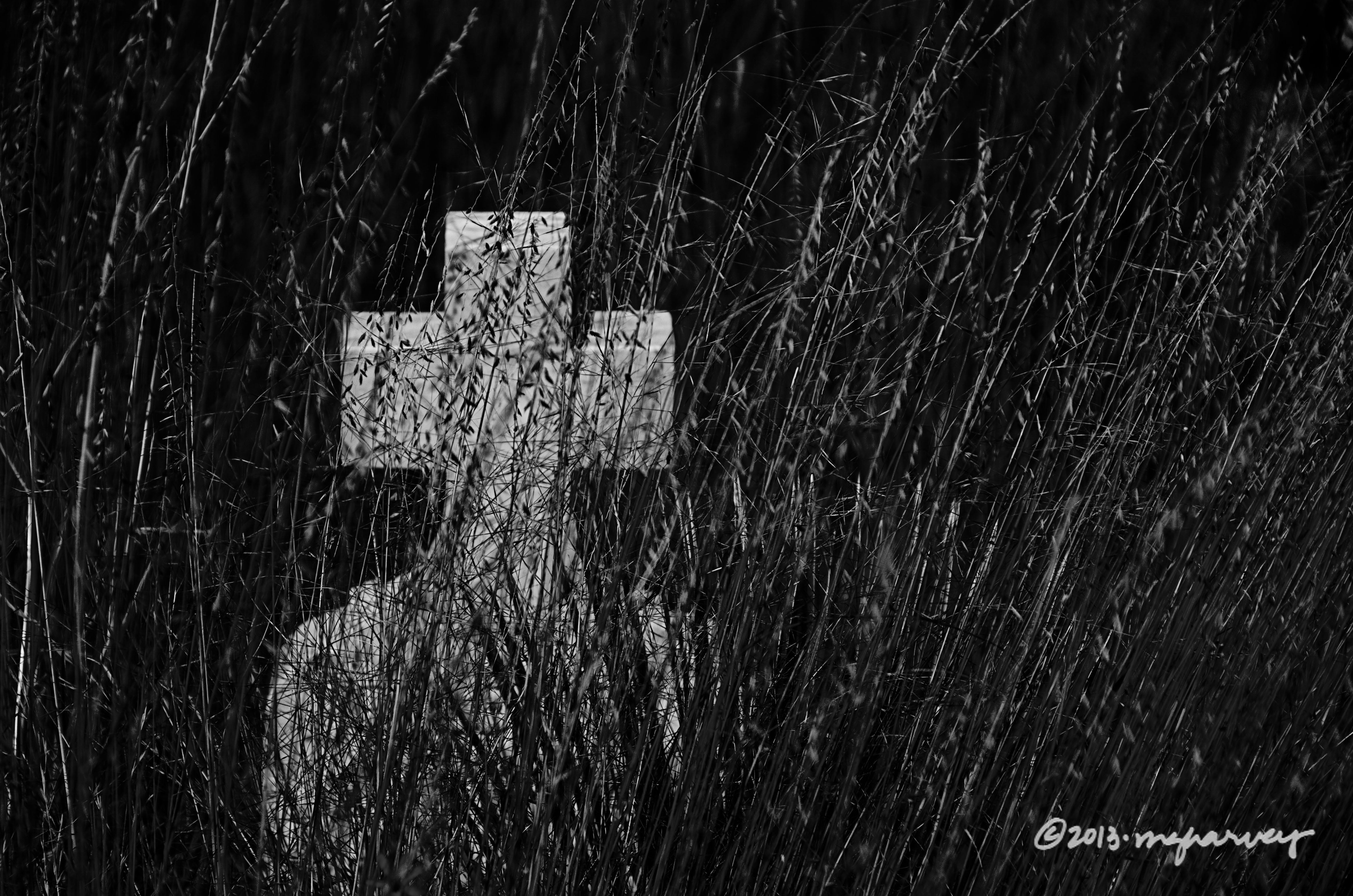 This time, when I looked at it, I was reminded of the little cross I saw in the cemetery in Marathon, Texas, which was also partially obscured by vegetation: