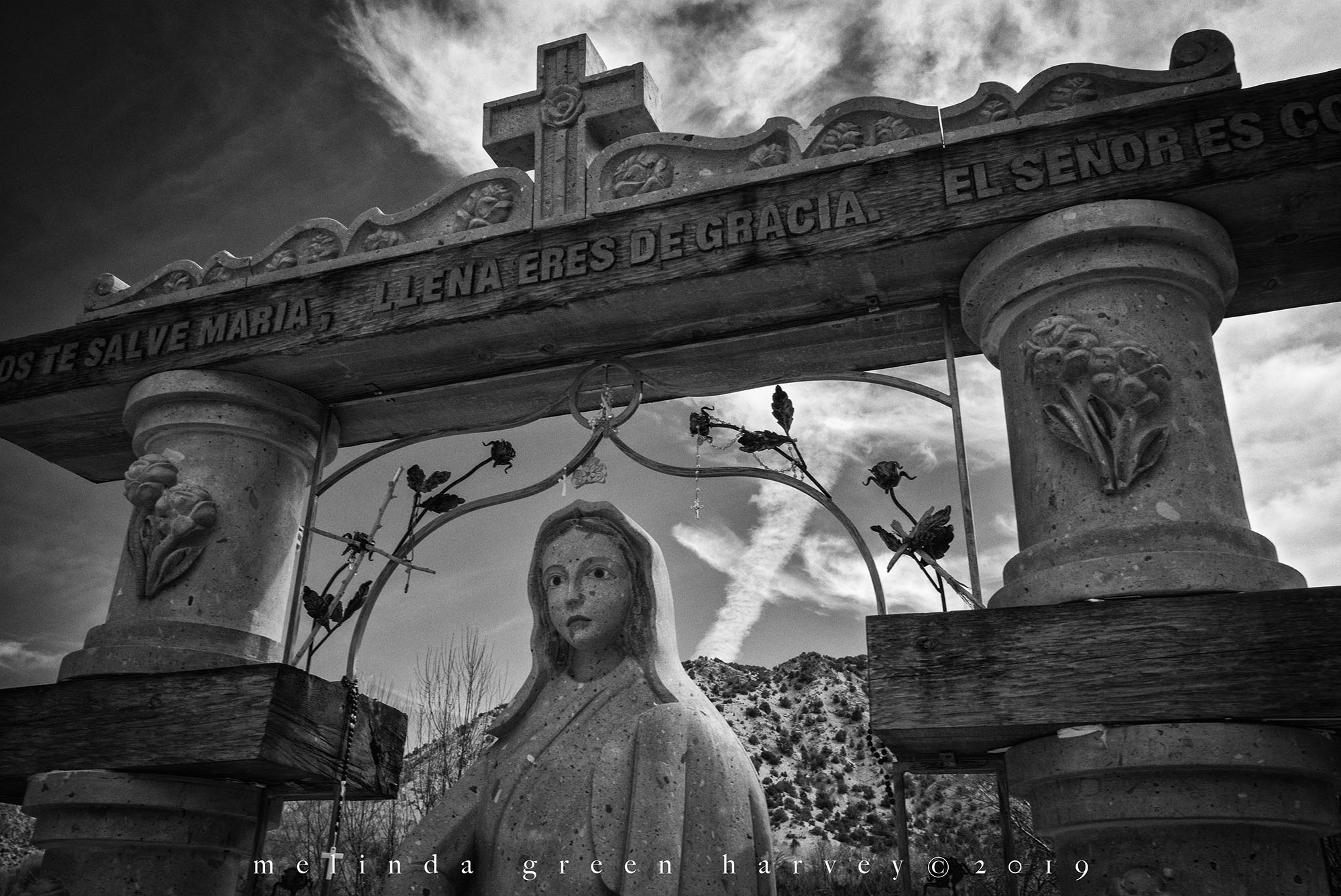 The walk from the parking area up to the sacred church has a chain link fence on one side where people leave crosses and other items woven into the wire. On my most recent visit, as I stood looking at the artifacts and to the building beyond, I let me eyes focus on the distance, which blurred the fence and its contents. And I made a photo.