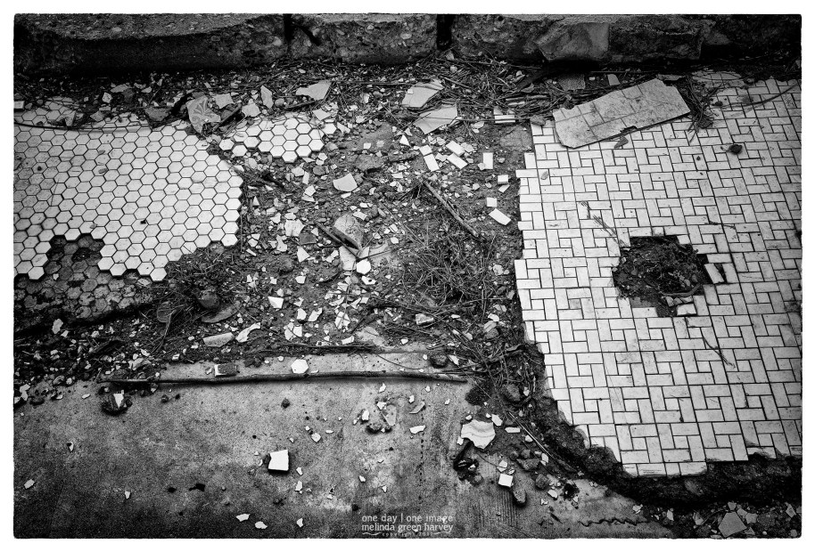 This is the floor from two different bathrooms, with a gap where the wall used to be. But it reminded me of M. C. Esher’s drawing of geese transforming themselves into fish, so in my mind*, that gap was the space where hexagons transformed into rectangles.