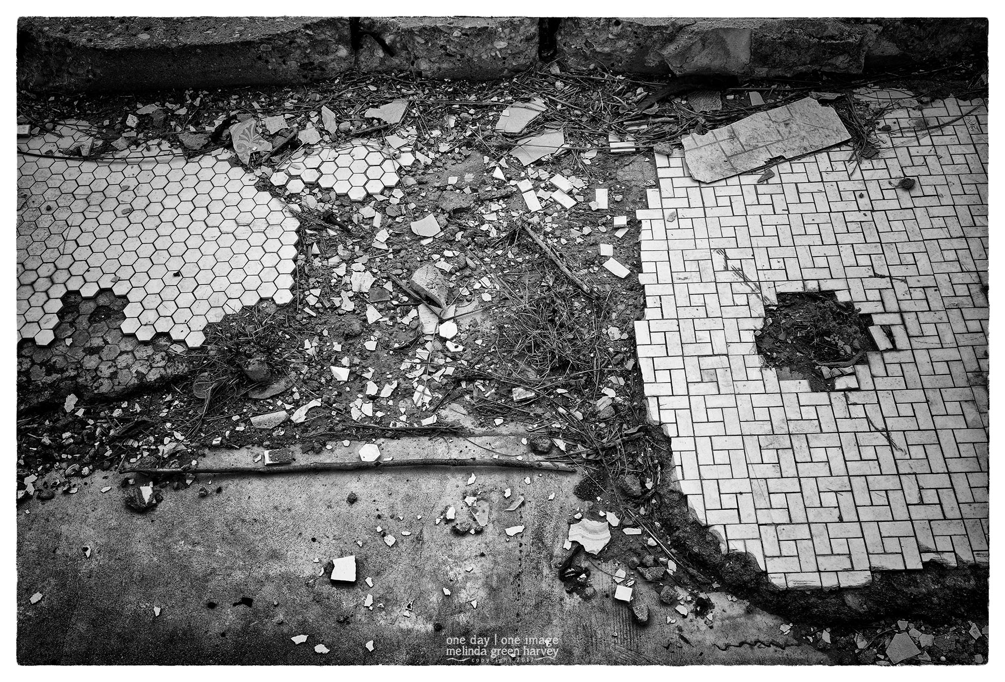 Some of the buildings that used to house the motel are down to the slab now, but the floor tile in the bathrooms is still in place.