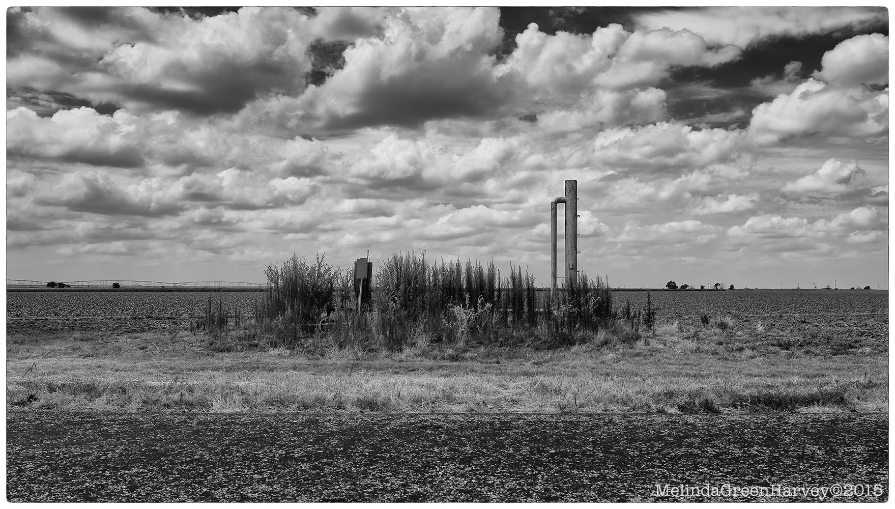 The reason for the u-turn was because he’d seen a big crescent wrench in the road and went back to get it. For highway-safety reasons, we will assume. Anyway, while we were doing that, I noticed this scene, and the way the weeds around the pump played off the clouds and the center-pivot irrigation system on the horizon. I’m glad for the wayward wrench.