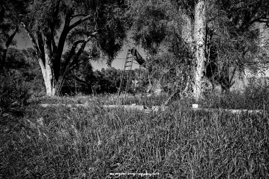 This place was a treasure of randomness. That tree growing in what used to be (before the roof fell apart) indoors. The upended sofa. The tires. The phone on the wall (which maybe has to direct connection with the phone booth, which is just across the street?). And that chair, providing both a place to sit and a measure of security with its placement in front of the door.