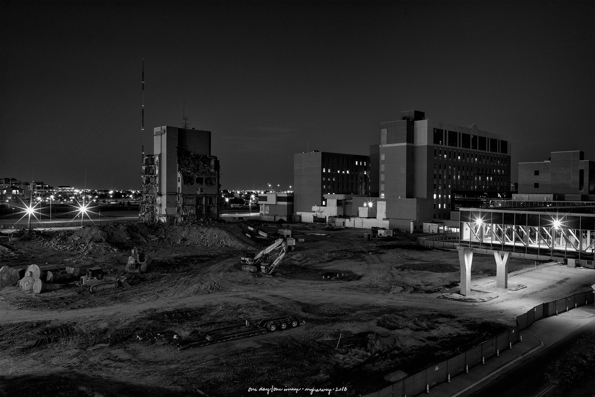 A couple of weeks after I made this shot, my friend with parking-garage access helped me get this photo. The tower is gone by now, but I suppose that heavy-construction equipment still prowls the site, getting things all level for whatever happens next…