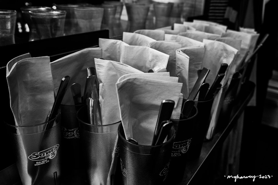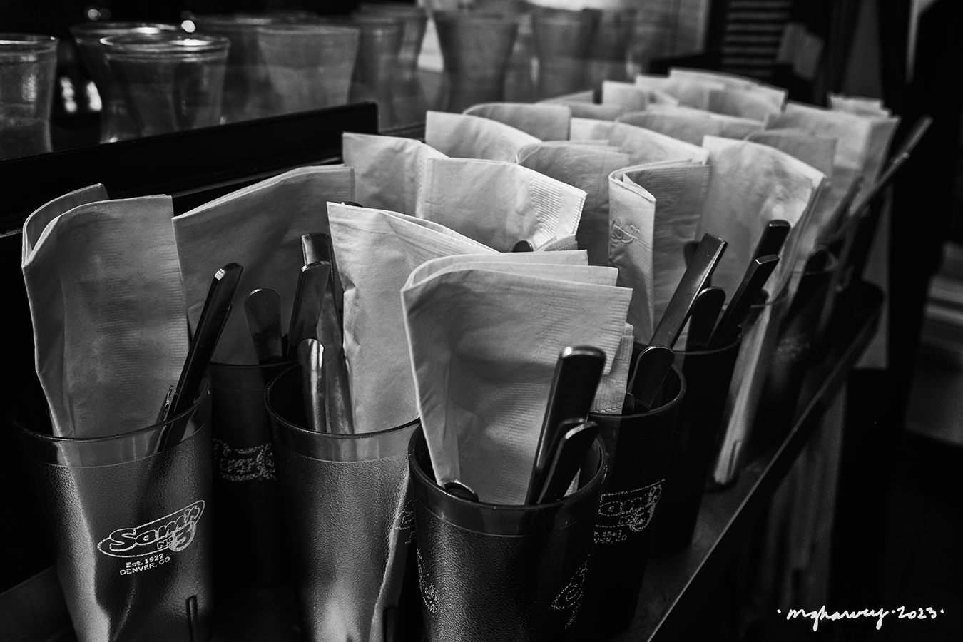 You probably already know this tip for eating in diners: always try for counter seating. That’ll give you a better behind-the-scenes view of the place, and give you the chance to photograph the time-saving technique of putting tableware and napkins in the glasses. You may have a little bit more time to chat with the servers.