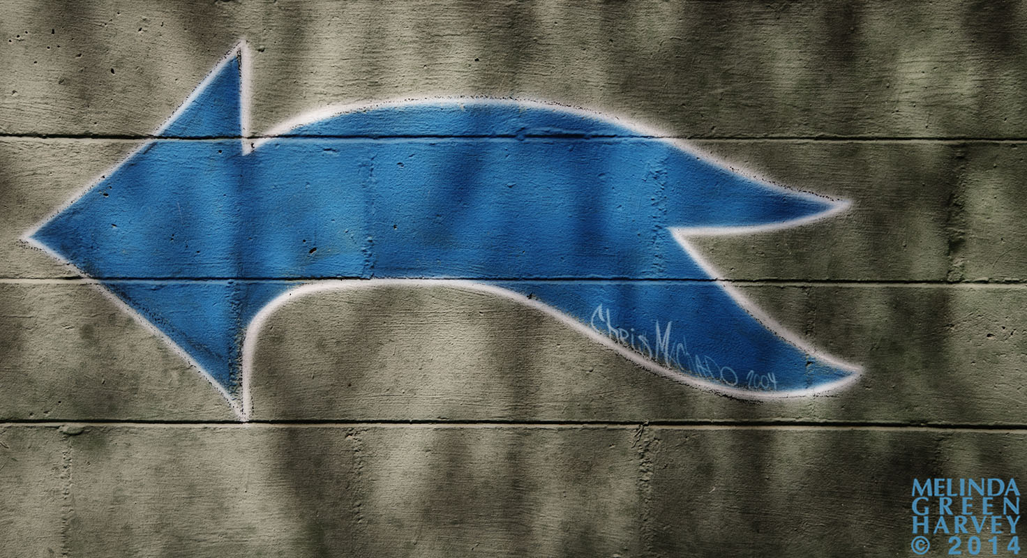 It was a wayfinding arrow, showing where the parking lot was, for a now-defunct restaurant in downtown Lubbock. I like the curves, the blue-and-white, the way the artist signed it, the dappled sunlight on the concrete block wall.