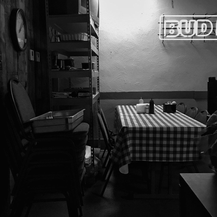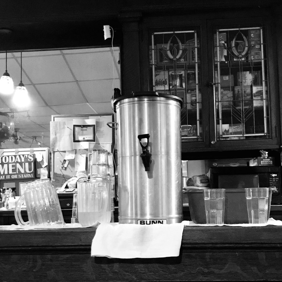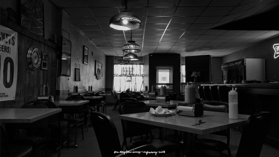 I ordered a burger, and the waitress said, “Now, it comes with pickles unless you don’t want pickles. Then we’ll leave them off.” I agreed to pickles, but didn’t realize until lunch arrived that she meant it came with ONLY pickles: a minimalist burger. We were on the end of the lunch rush – by the time the 1:00 siren sounded* everyone but us had left to head back to work.