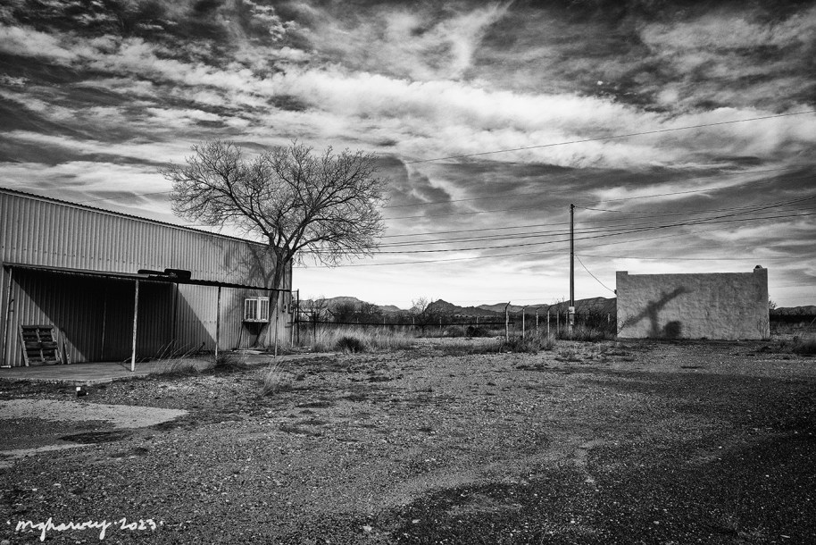 I like the rhyme on the sign. I like the rhythm of the utility poles. I like the amount of sky. I like the desert. I like those mountains down the way. I like the slightly back-lit effect on the flag.