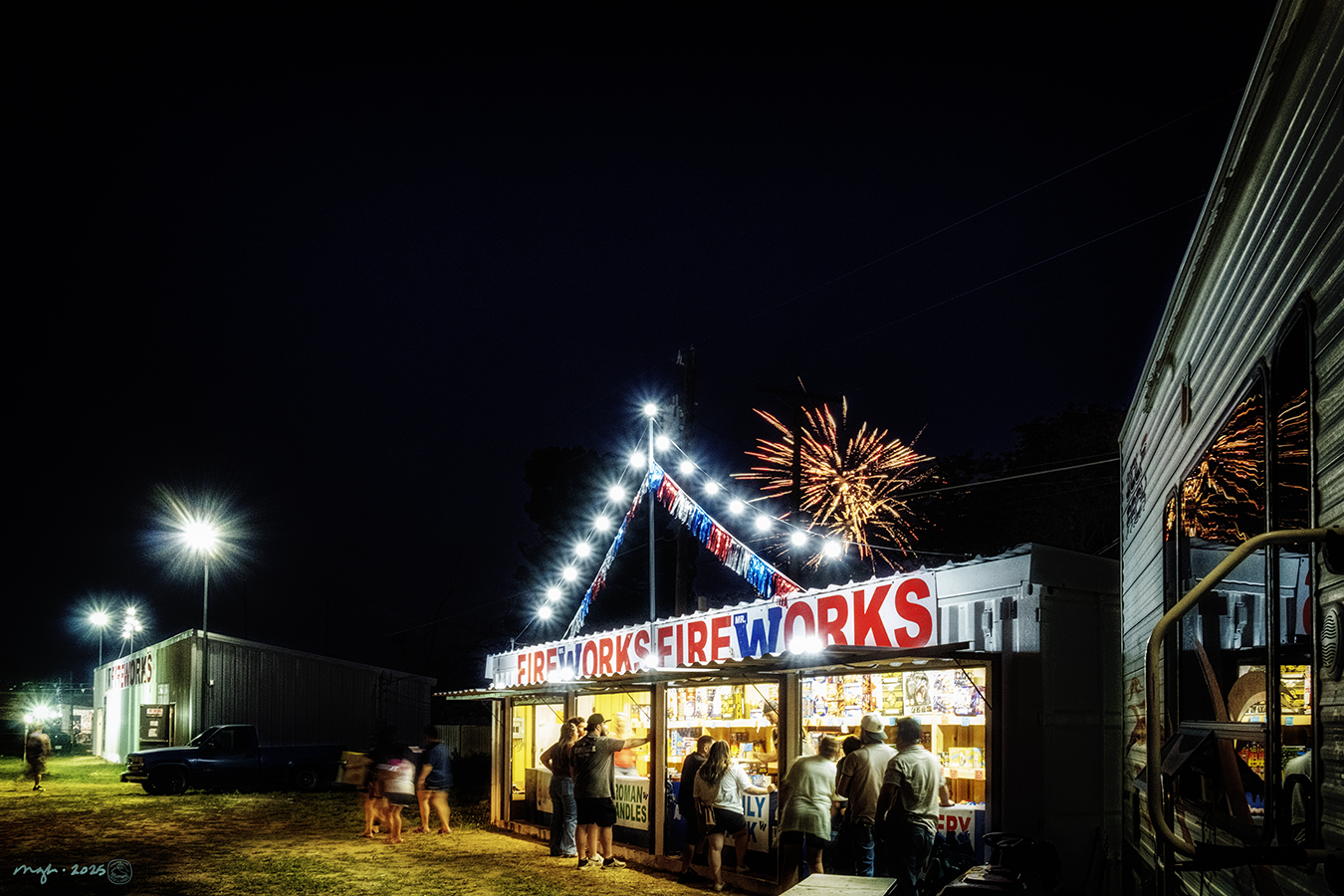 I can’t tell you how I know this, but if you have a very specific shot in mind – say a relatively empty parking lot at a fireworks stand so you can get photos of blurry people moving back and forth to buy bottle rockets or whatever – a much better idea is to go and get this shot on a night that is NOT the last night that the fireworks stands are open.
