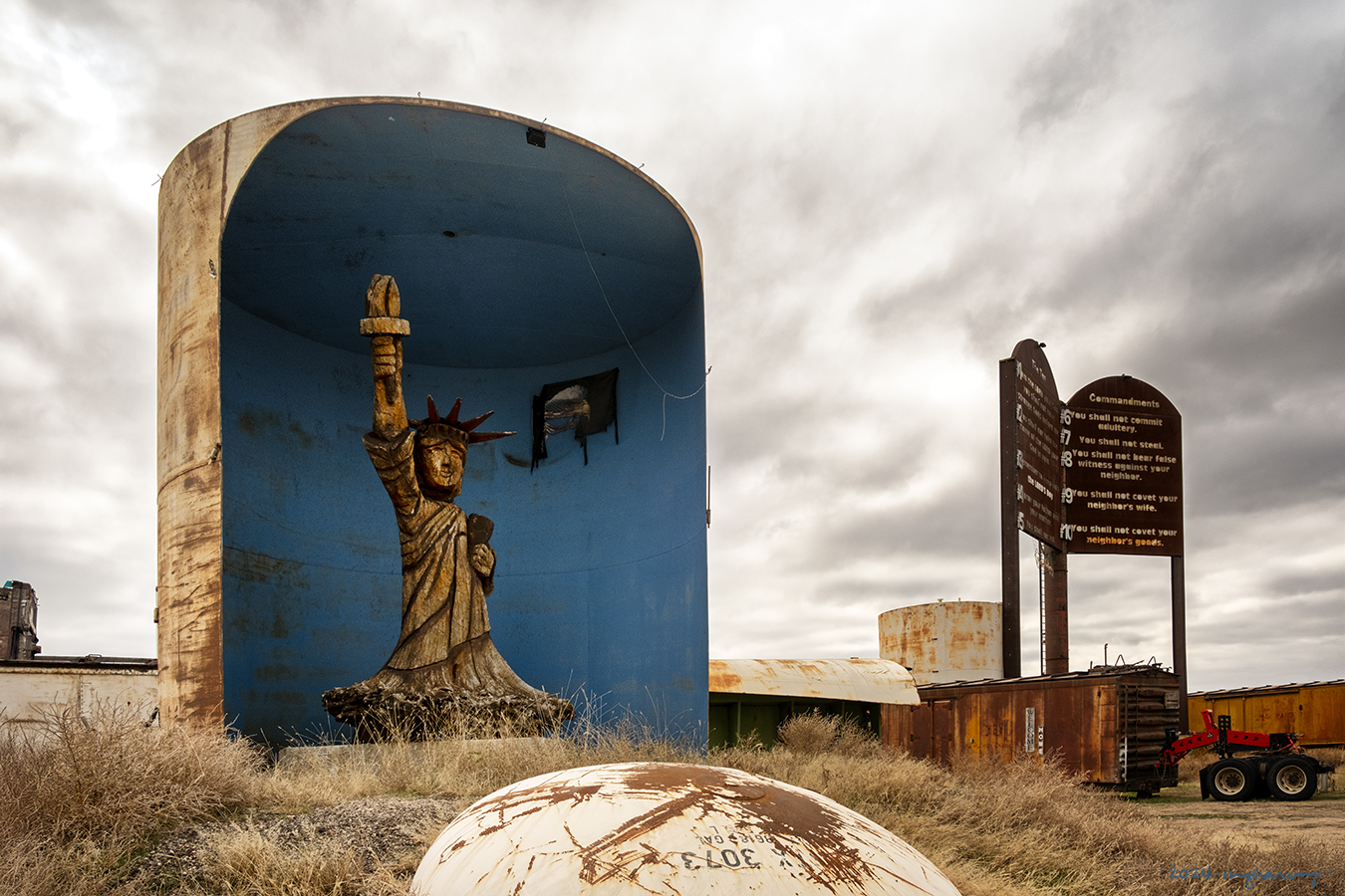 The Statue of Liberty is made from a stump of one of the town trees that died; it was carved by a regionally-famous chainsaw carver.