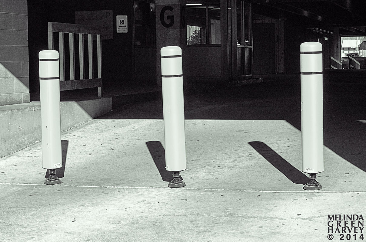 These three skinny sentries keep (everyone hopes) cars from turning into the pedestrian walkway at this parking garage. I like how the concrete is discolored where people walk, and lighter where they don’t. And I like the way the posts lean slightly in different directions, as though they are getting tired of standing there.