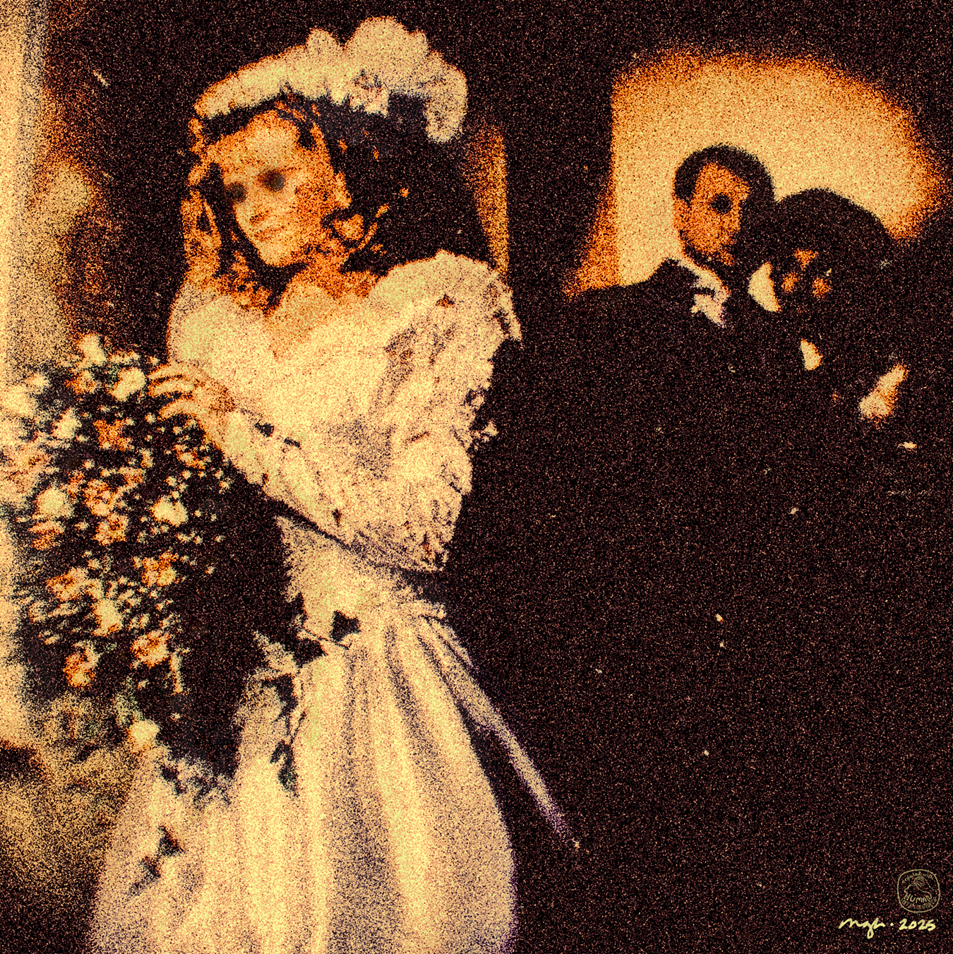 This poor bride. Not only are sleeves, her hair, her headdress, and her veil so big they barely fit in the picture, but her parents are lurking over there in the corner in a way that seems sort of predatory.