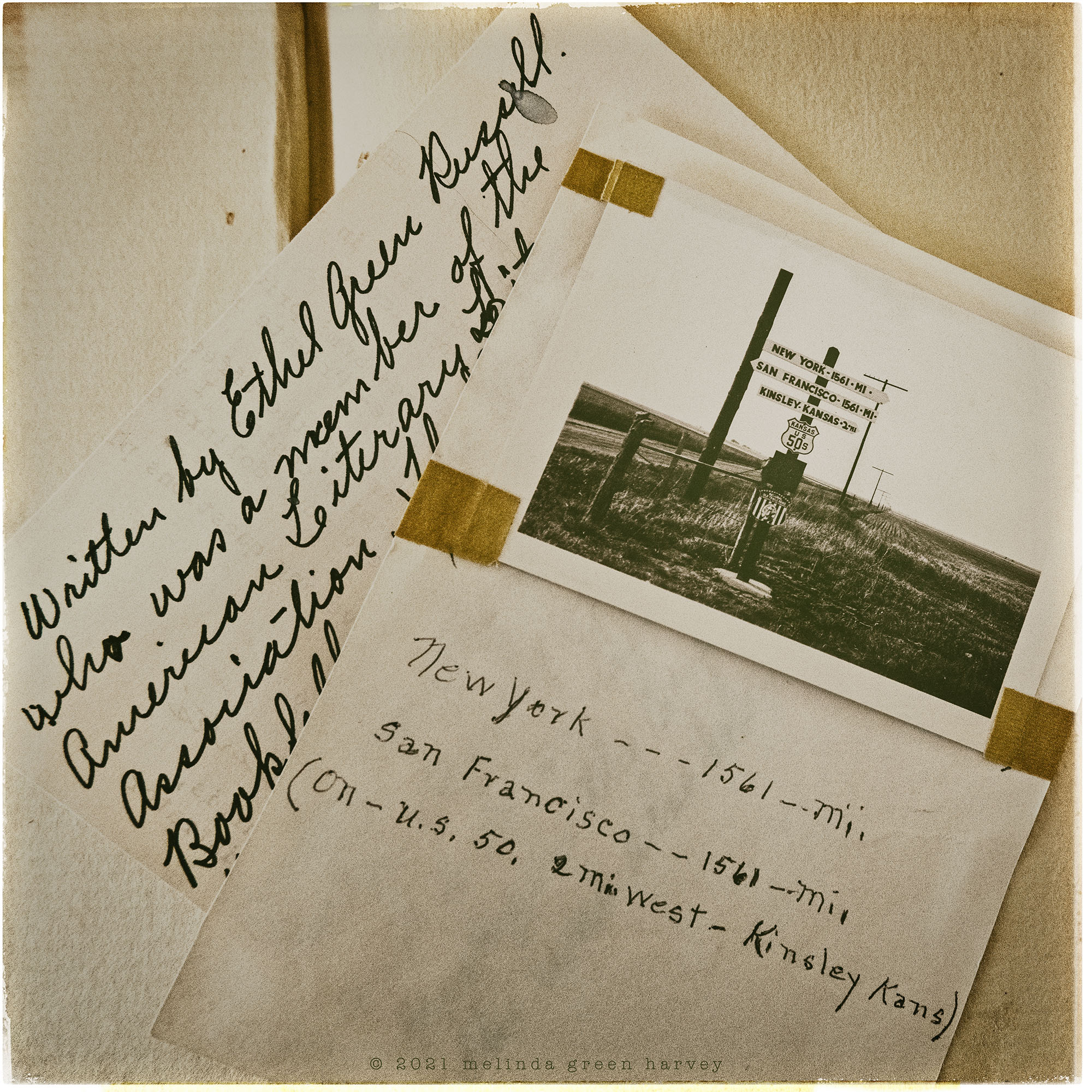 Inside one of the books is a handwritten note with some details about her career. There is also a tiny photograph, taken outside of a small Kansas town that is equidistant from New York and San Francisco, on US Highway 50. I recently became aware that this highway traverses nearly the entire country, going from the shores of Maryland to Sacramento, California; I have a strong desire to take the drive, making photos along the way. But I had never recalled that this little photograph was made along the route I dream of driving.