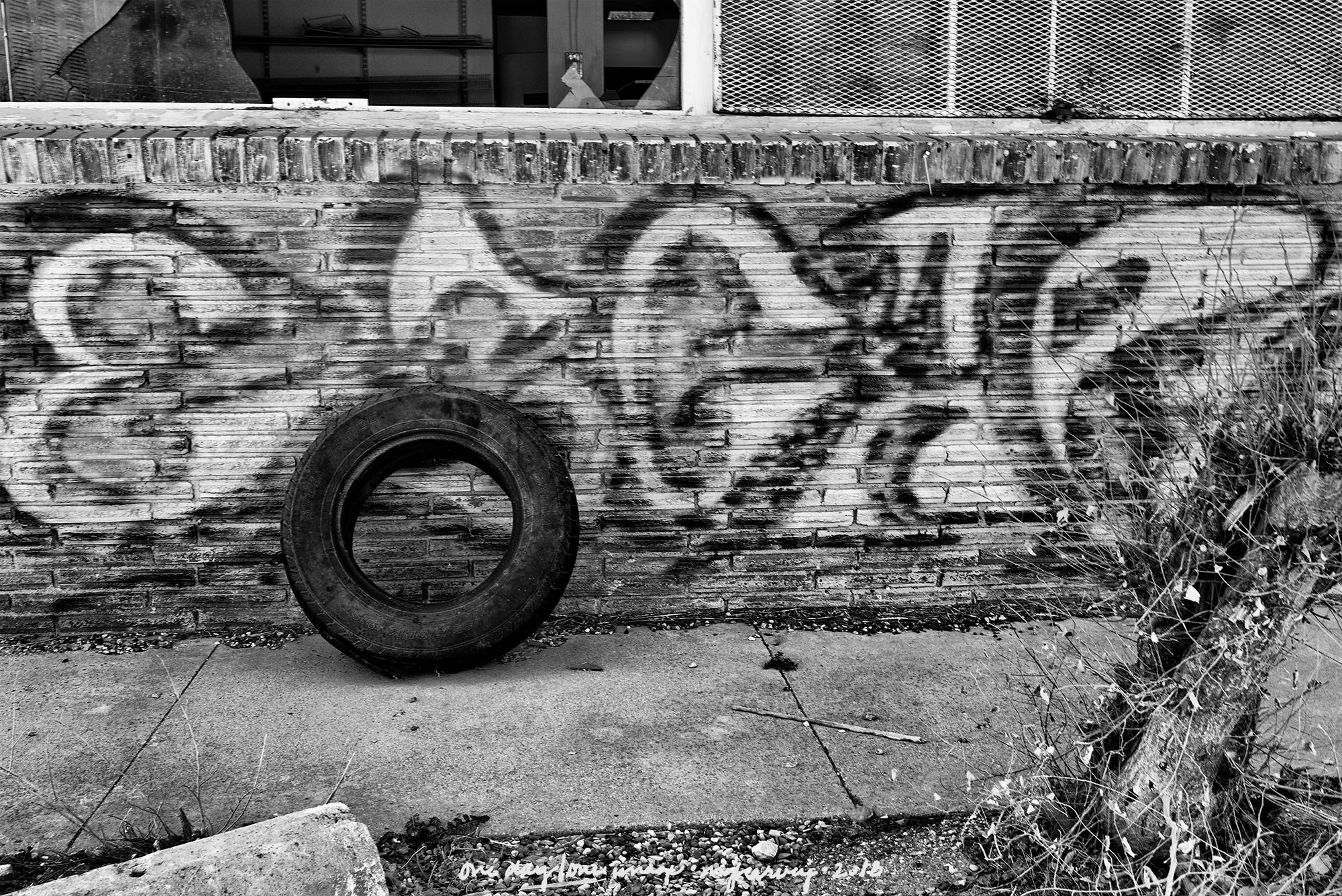 Another dead elm tree delivers the coup de grâce to an abandoned farmhouse. The only difference here is that this particular house has been decorated, for reasons that I can’t know.*