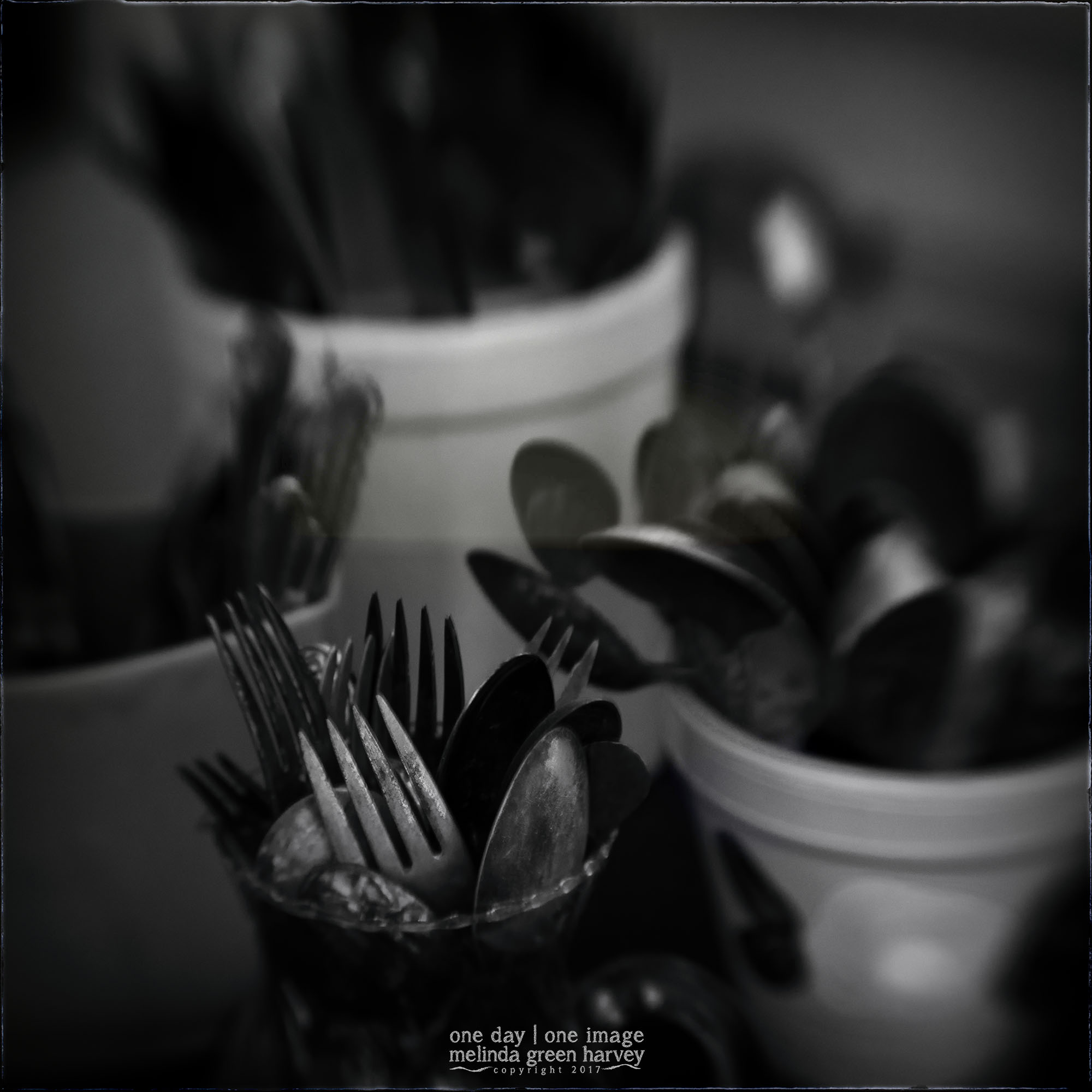 So I did what he said. I saw the LensBaby in the drawer and decided to see what I could do. And I saw that collection of mismatched silverware, inspired by the book, which inspired a poem.