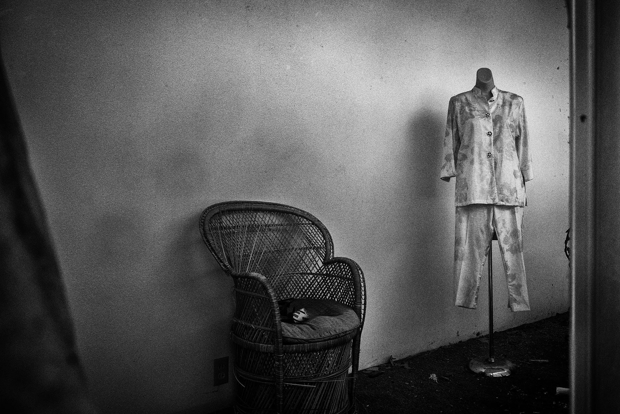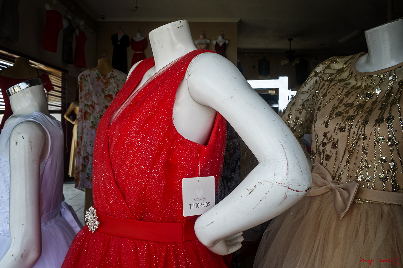 The windows at this out-of-business store were papered over, probably to keep people like me from peeking inside. However, a tape failure gave me the opportunity I was seeking. And I try to not let opportunities pass me by – I think they’re placed in my path for a reason – so I sure did look into the display window. And was richly rewarded by those pajamas. Although those buttons look like they are not very sleep-friendly, which may account for the pjs never selling.