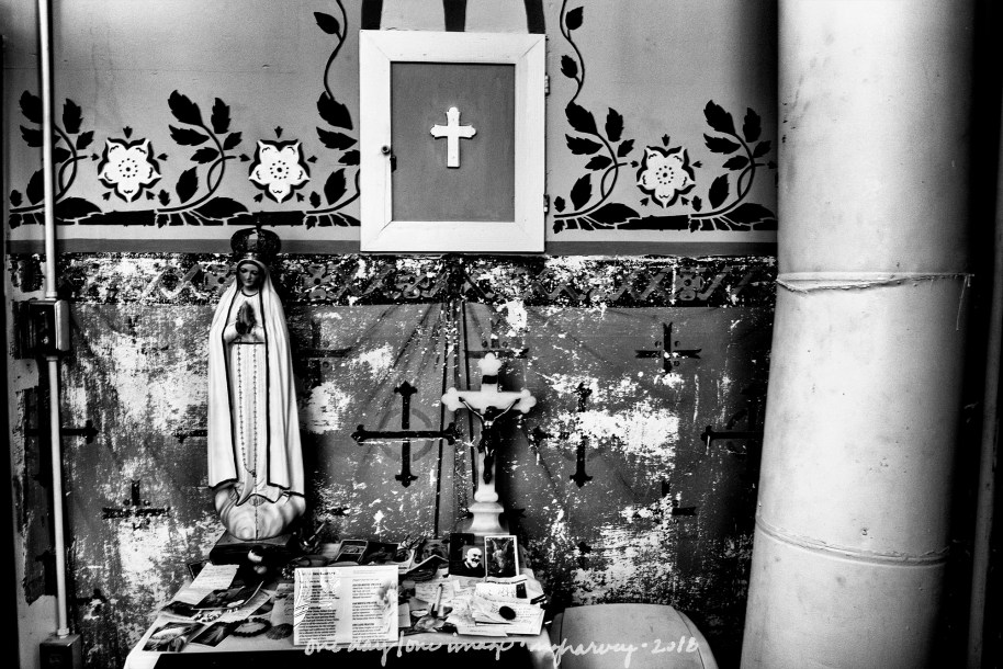 The next one I found was in High Hill, where I found this little altar around the corner from the main entrance, tucked in beside a crooked column. There was a barricade around the altar, so I wasn’t able to examine the things that had been left there. (There were also some other people in the church which sort of…hindered my exploration. If you know what I mean.)