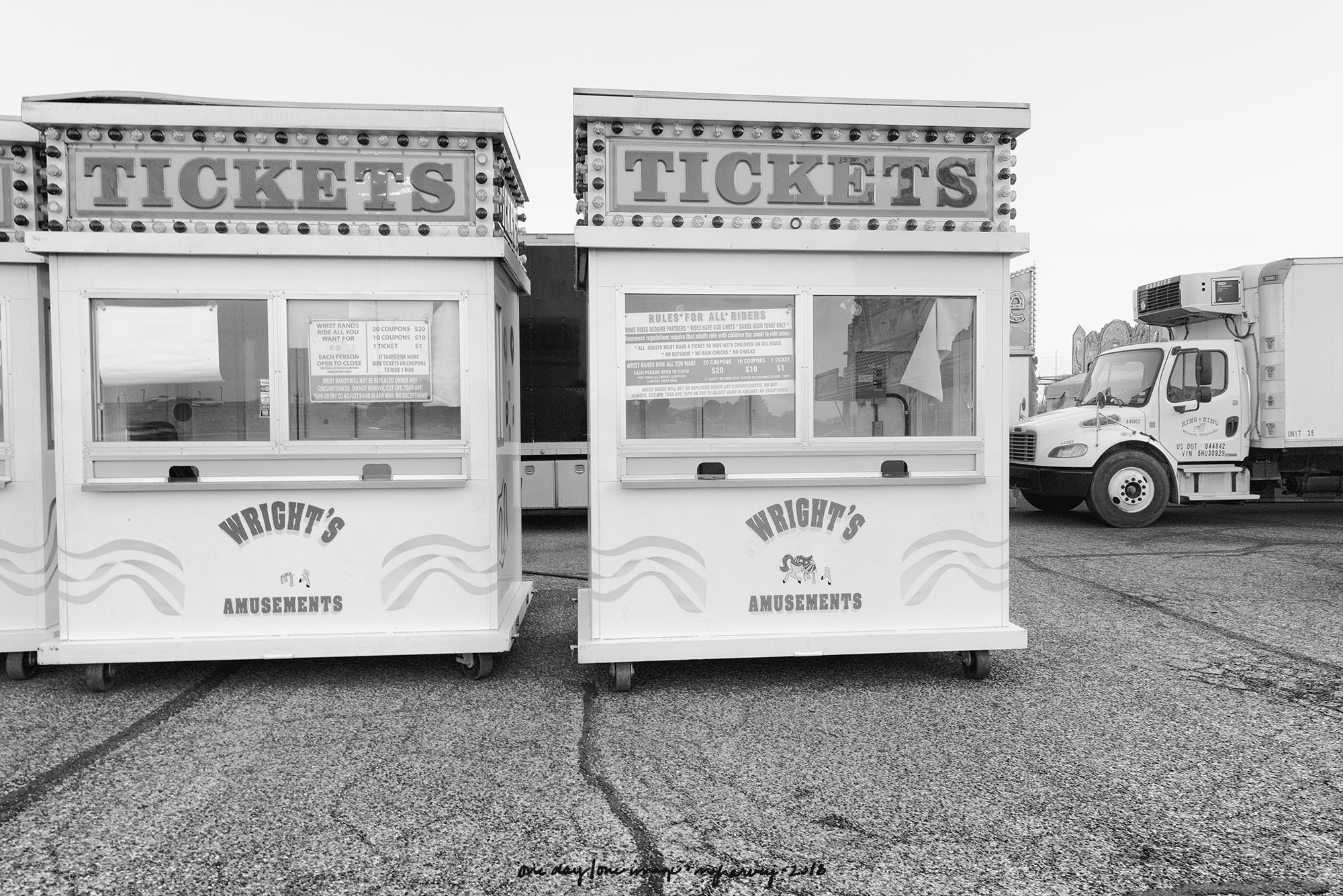 Ticket booths, a truck, and early morning light: the carnival.