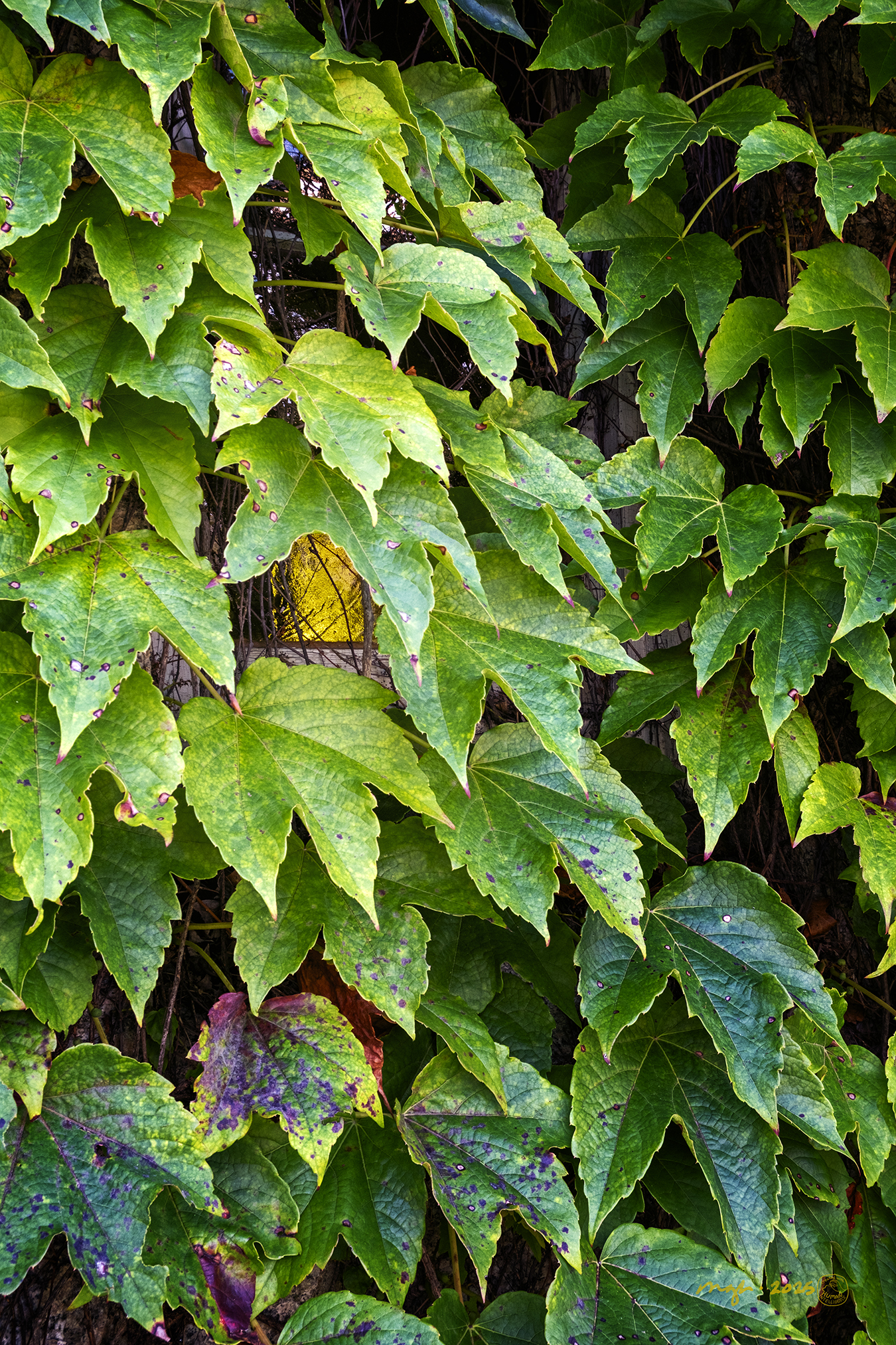The cemetery chapel was covered with ivy that was just starting to think about putting on its fall reds, which would have been a beautiful display. But, really, I didn’t hate the way it looked when I saw it, and especially liked the way the wavy gold glass was peeking through the leaves.