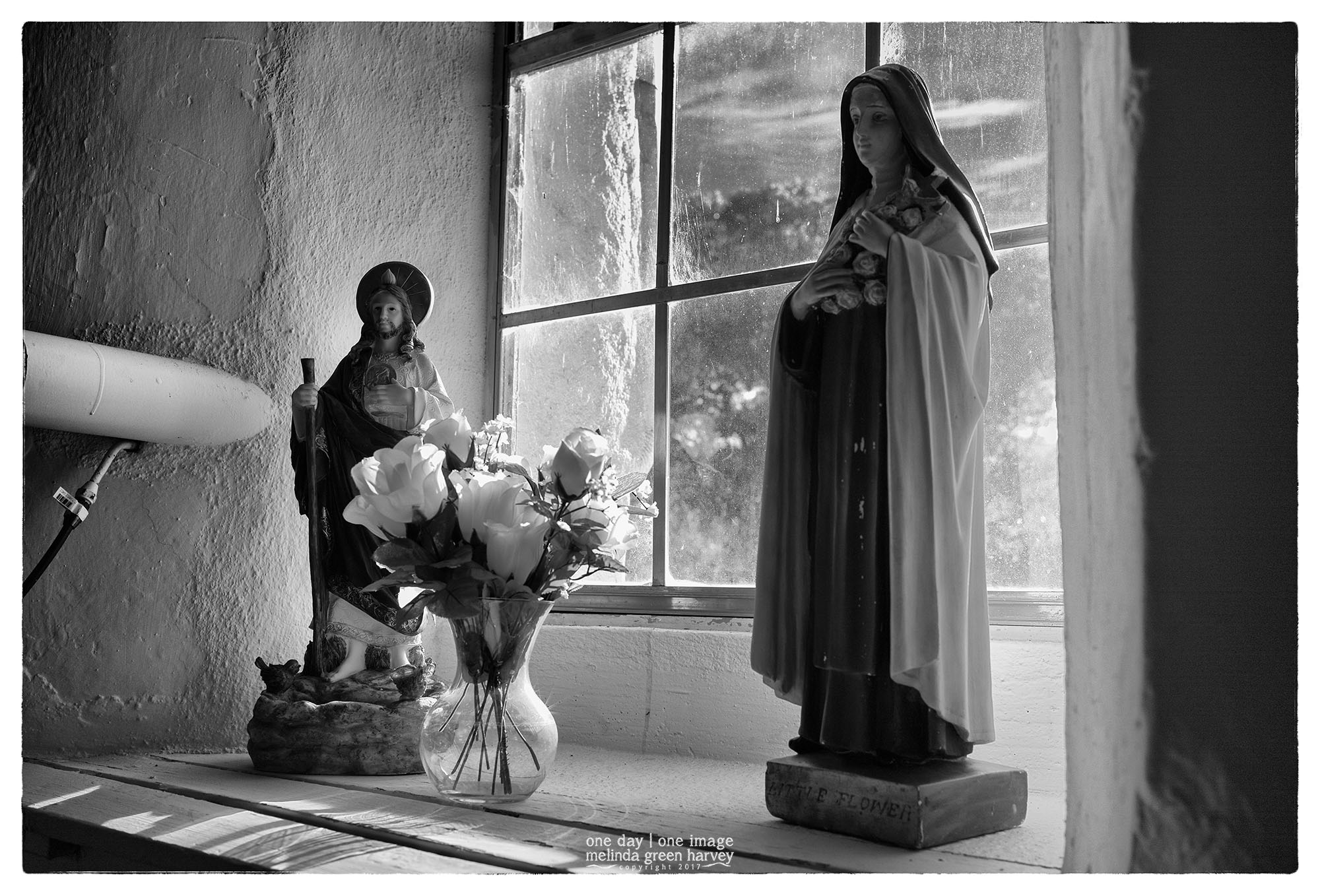 The biggest building in town is the Sacred Heart of Jesus Catholic Church; a notice posted next to the front door said Mass is celebrated there on the third Sunday of each month, at 2:00 p.m. That door was locked, but the side door wasn’t. I let myself in and spent a happy hour inside exploring and photographing.