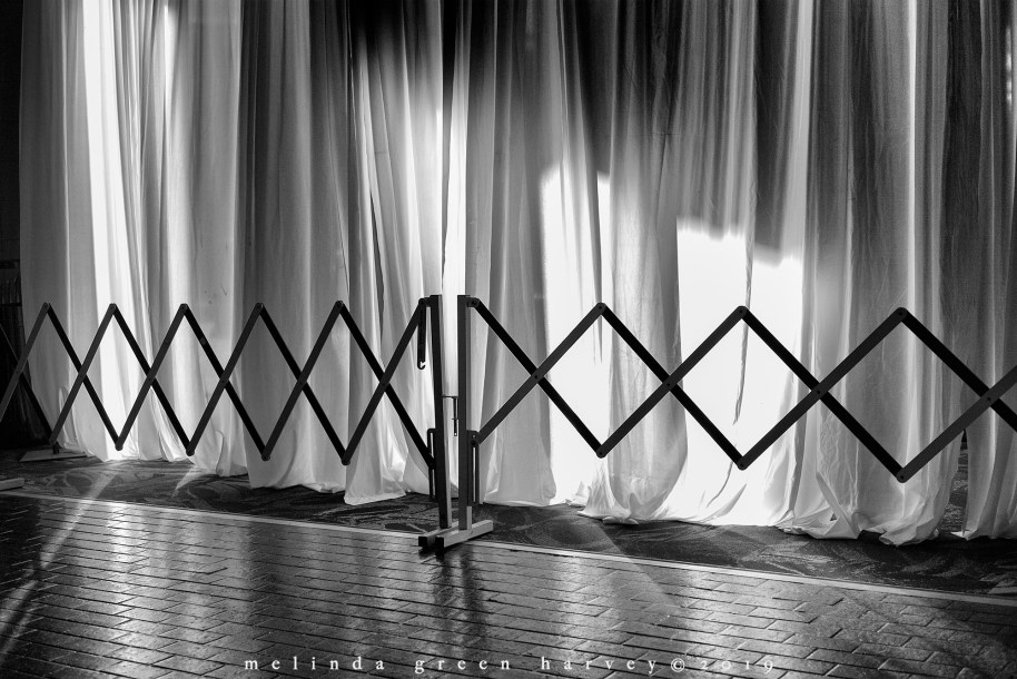 The fun thing about big event centers is that sometimes scheduled events may not always exactly align. A fancy fundraising event was scheduled just across a walkway from the tattoo expo, and I guess these drapes and fence were supposed to prevent any overlap.