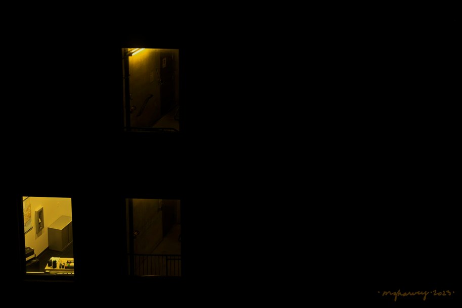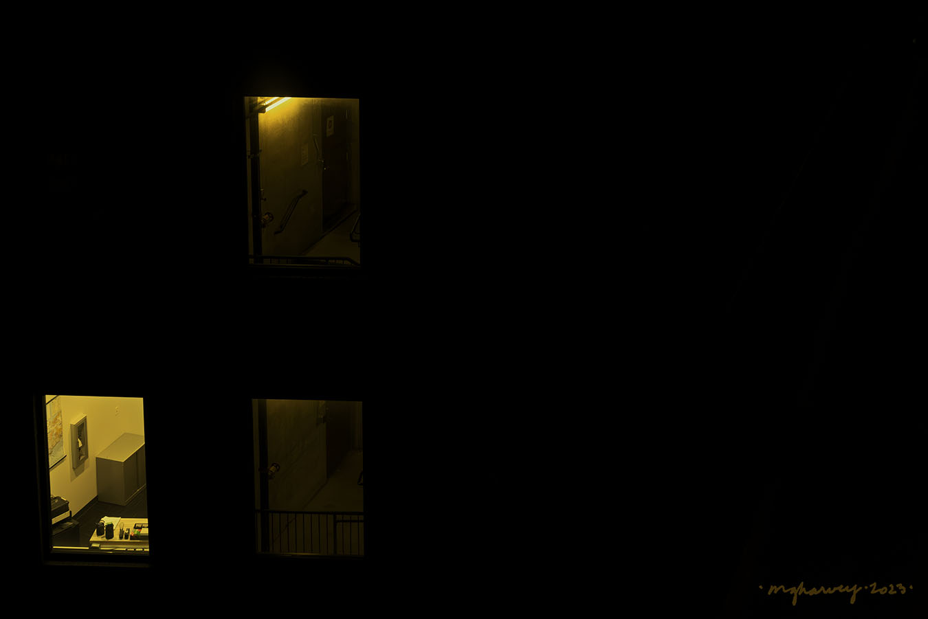 I guess I ought to have wished for a room with a more traditionally scenic view – maybe the river or downtown or whatever. But on the other hand: while this isn’t “scenic” in the traditional sense, I was very fond of the three lighted windows in an otherwise dark building across the street.