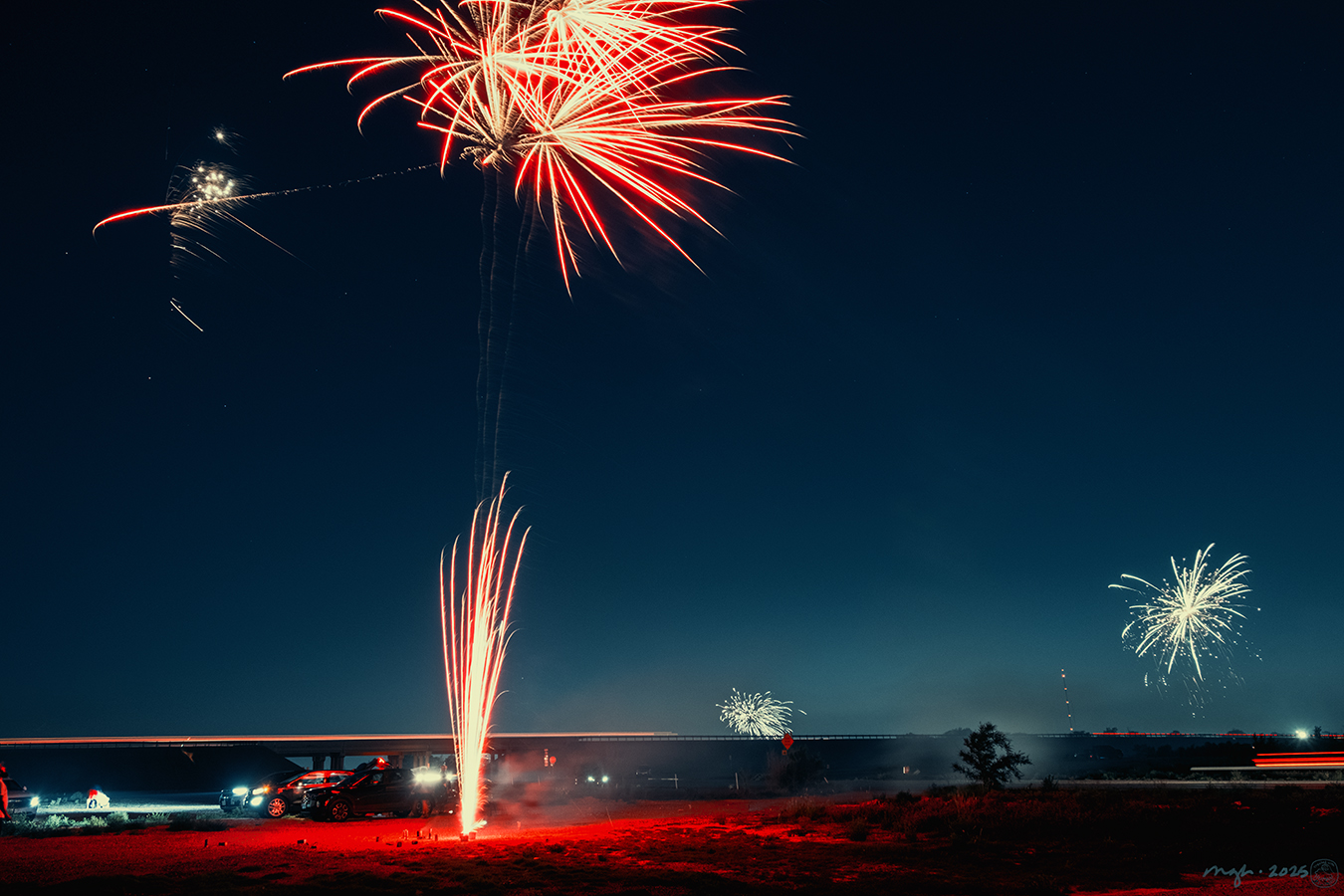 This was fun – we found a place out on the very edge of town where people congregated to shoot fireworks and we spent at least an hour out there watching all the fun. I took 805 photos, deleted all but 52 of them because they were (a) just dark empty sky; (b) blurry only not in a good way; or (c) stupid. And of those 52, I edited TWO of them.