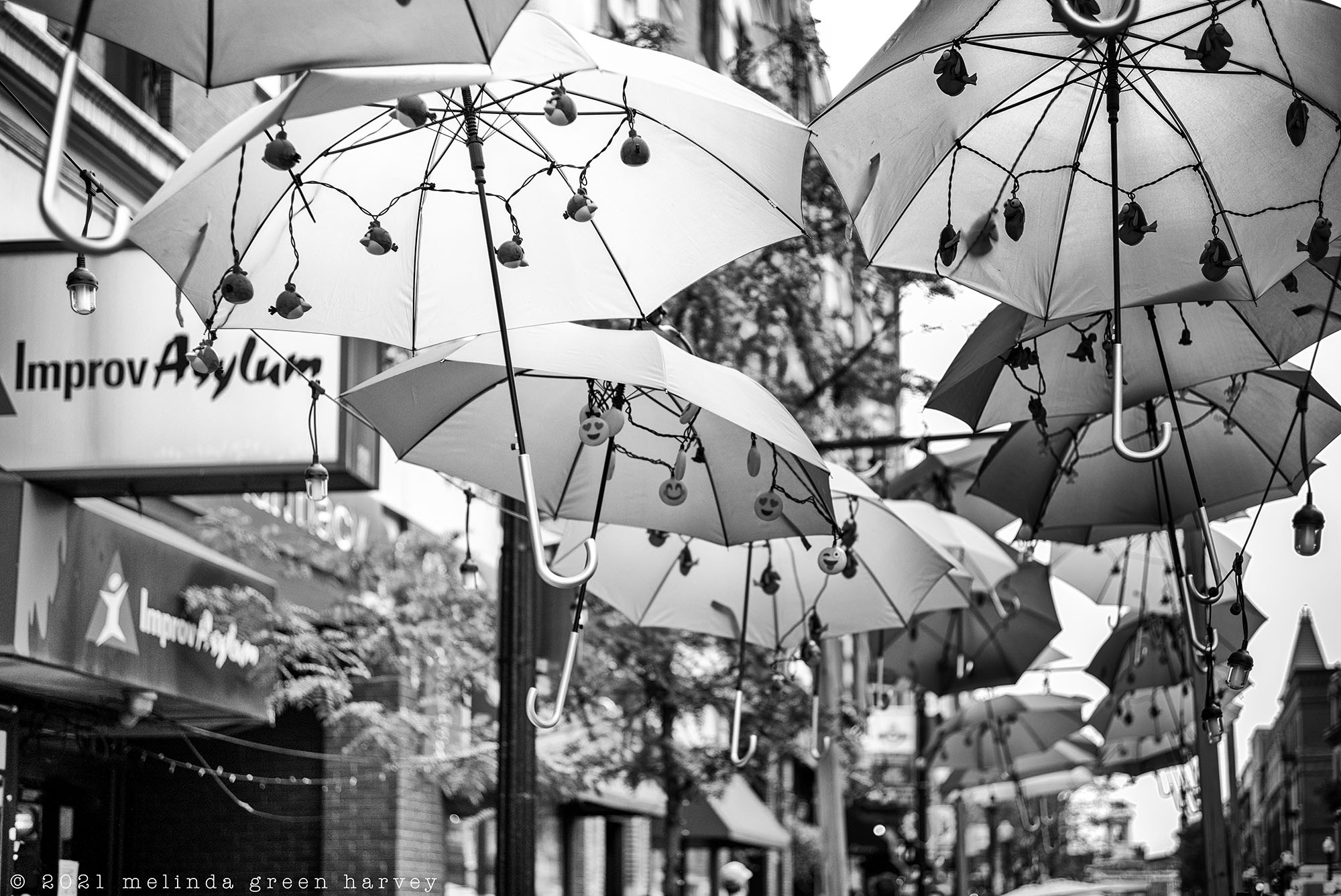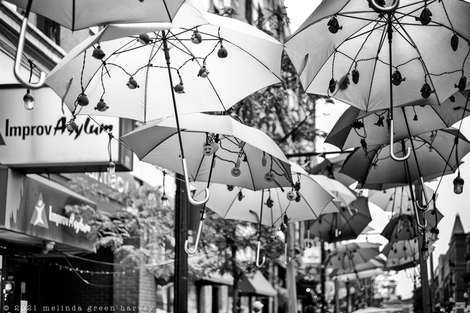Just like I will walk around to the back of things, I will also always peer down narrow passages like this. It was a rich reward, with the brick walls, the stoop, the door with the worn-away paint at the bottom, the window reflections. But mostly: that umbrella!