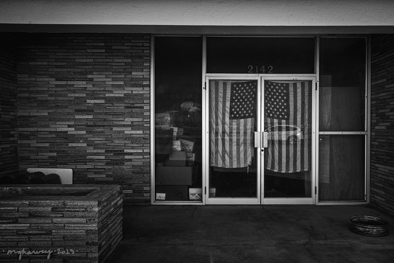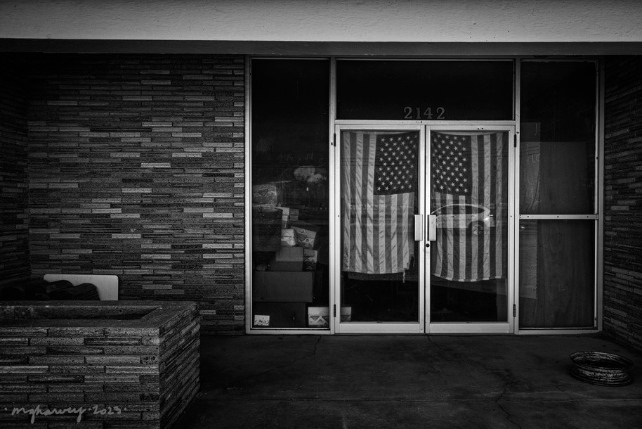 I don’t know why this place caught my eye. And I don’t know why, once my eye had been caught, I didn’t even stop to photograph it. But an hour later I was still thinking about those two flags and how they’d been pressed into service as curtains. So I did the only thing I knew to do.