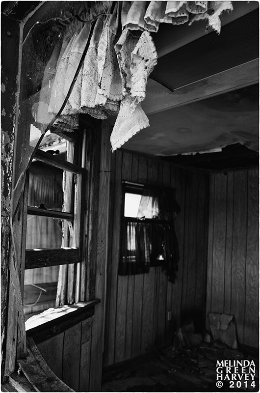 This place was right by the dirt road that heads east out of Pep, and there was no fence, so I stomped through the scratchy remains of last summer’s weeds and had a look. The remains of the house were pretty sad – some ragged curtains that’ve been sawed down from constant blowing against broken glass, a kitchen counter that was saggy from water damage (it must be very old water damage: it hasn’t rained in ages), and the usual random piles of crap (literally and figuratively) that these kinds of places tend to have. As you can tell from the slits of light against the interior walls, the roof has holes. A roof with holes is a roof that’s not going to last. And once the roof goes….