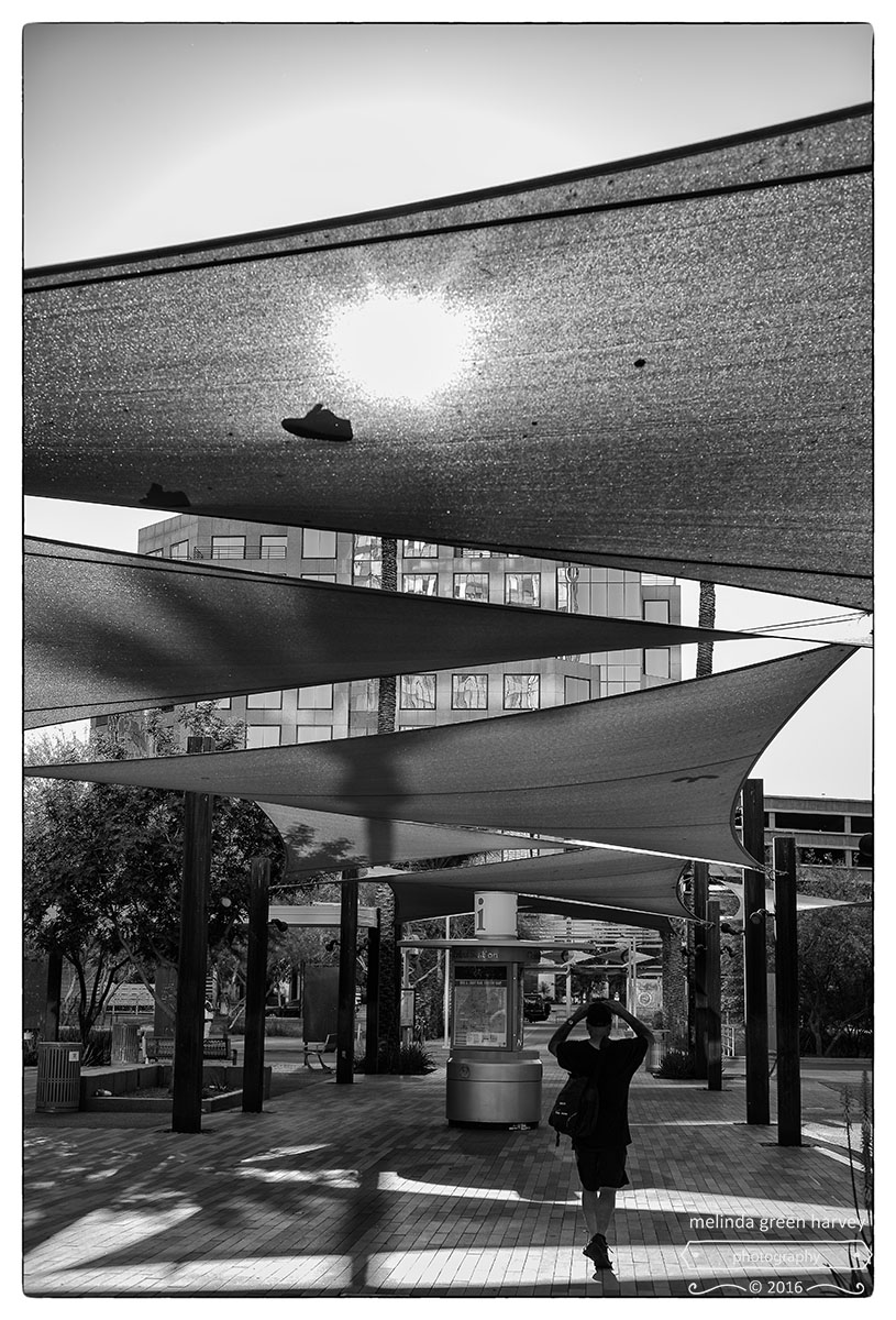 While I was waiting on the light rail, I glanced around to see what I could find to photograph. The sun through the shade fabric made a nice silhouette of those two shoes, so I was content.
