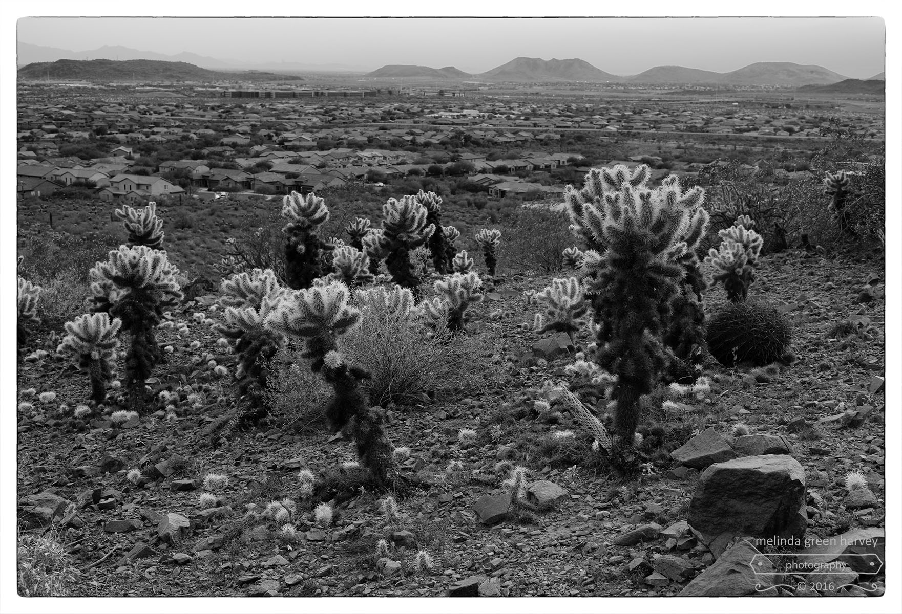 We took a little hike (where we saw a nesting Great Horned owl and one of her babies), and on our way back down, got to see the new growth on the cholla cacti nicely backlit. (We liked the light-on-cactus a lot better than the very close subdivisions.)
