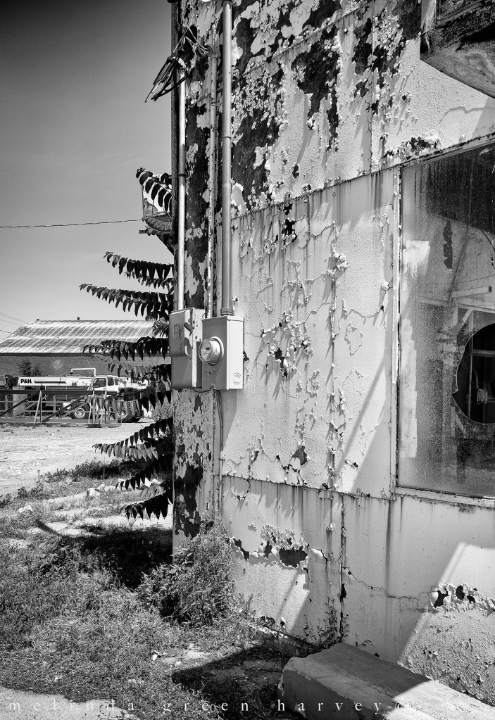 I have certain rules that I follow when I shoot, and one of them is that I never want to make a photo that could be construed as making fun of someone living in poverty, or of someone whose sense of decorum is different than my own; that’s why you’ll almost never seen photos of run-down houses that are currently occupied and why you’ll never see photos of people living on the street. I don’t mean to be judgey about people who DO shoot those things – it’s just not my thing.. So, generally, places like this go undocumented with my camera. But, that wedding dress! Over there on the porch, set aside from the other, regular clothes on racks in the yard – I just couldn’t resist.